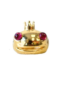 Frog prince ring in gold with pink eyes. Gold plated recycled pewter Made in the USA This is a costume jewelry piece. Please use care with this item and do not wear while bathing or swimming. Excessive wear may cause the finish to deteriorate. Jewelry bag handmade with fabric scraps from our NY studio. Each jewelry bag is one of a kind.