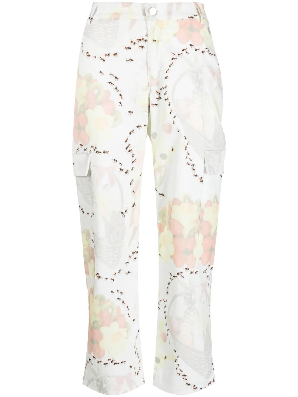 graphic-print trousers Highlights - White/multicolour - Cotton - All-over graphic print - Mid-rise - Belt loops - Front button and zip fastening - Two side inset pockets - Two side cargo pockets - Two rear patch pockets Made in United States Composition Cotton 100% SIZE & FIT Model measurements Height 5 ft 10 in(1.77 m) Bust/Chest 31.49 in(80 cm) Hips 35.43 in(90 cm) Waist 25.19 in(64 cm) FittingInformation Designed for a straight-leg fit, these trousers allow for a close fit at the waist and an unrestricted, comfortable fit over the leg Cropped in length Made from a midweight non-stretch fabric This piece fits true to size – take your usual size