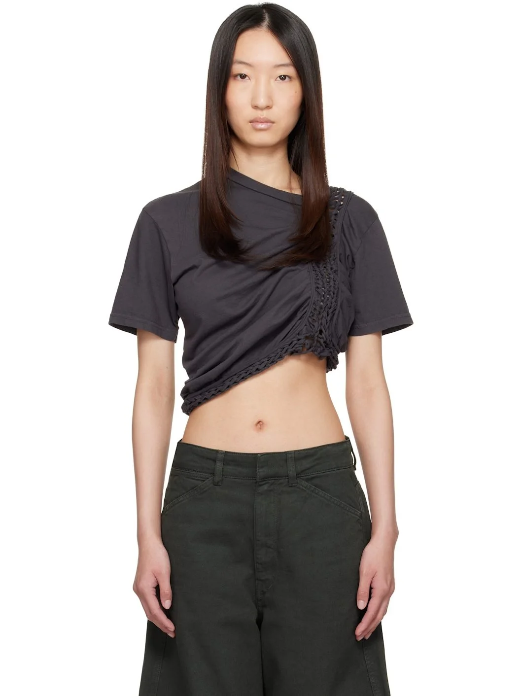 Organic cotton jersey T-shirt. · Offset rib-knit crewneck · Open-braided detailing at front, hem, and back · Asymmetrical hem Supplier color: Charcoal 100% organic cotton. Made in United States 252236F110006