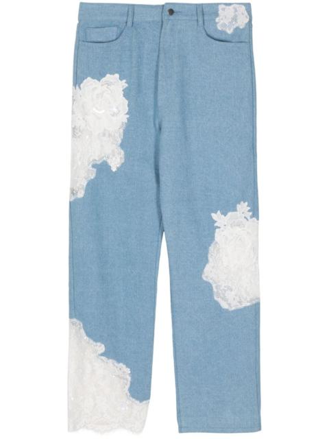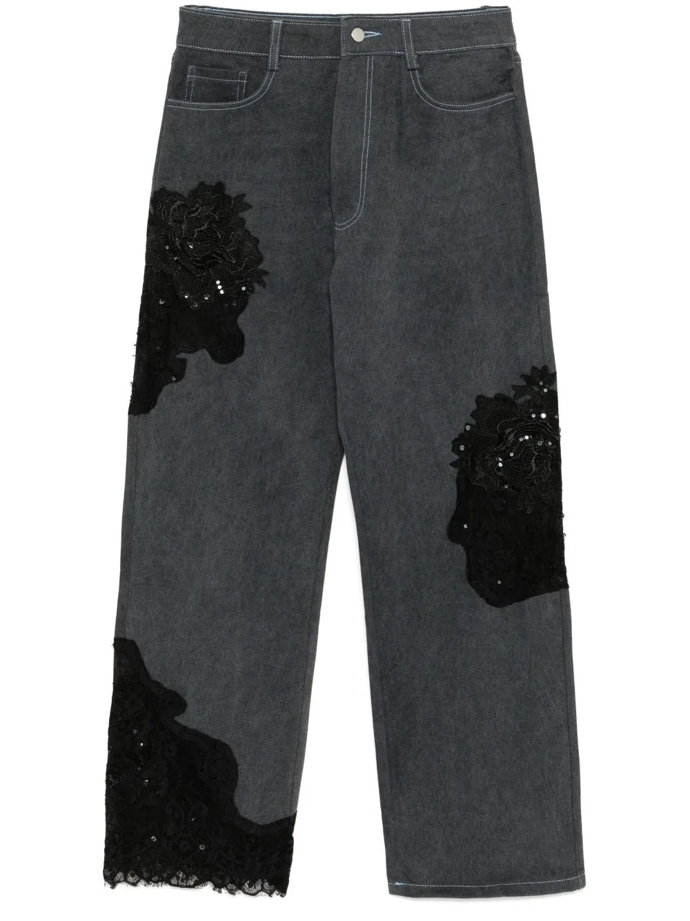 lace panels straight-leg jeans Highlights - Charcoal grey/black - Cotton - Denim - Front button and zip fastening - Belt loops - Contrast stitching - Classic five pockets - Whiskering effect - Faded effect - Lace panels - Sequin embellishment - Bead embellishment - Straight leg Imported Composition Outer: Cotton 100% Trims: Nylon 100% SIZE & FIT Model measurements Height 5 ft 9 in(1.76 m) Bust/Chest 31.1 in(79 cm) Hips 35.03 in(89 cm) Waist 24.4 in(62 cm) FittingInformation Designed for a straight-leg fit, these jeans allow for a close fit at the waist and an unrestricted and comfortable fit over the leg Sturdy and hard-wearing, this denim piece offers no stretch Washing instructions Dry Clean Only