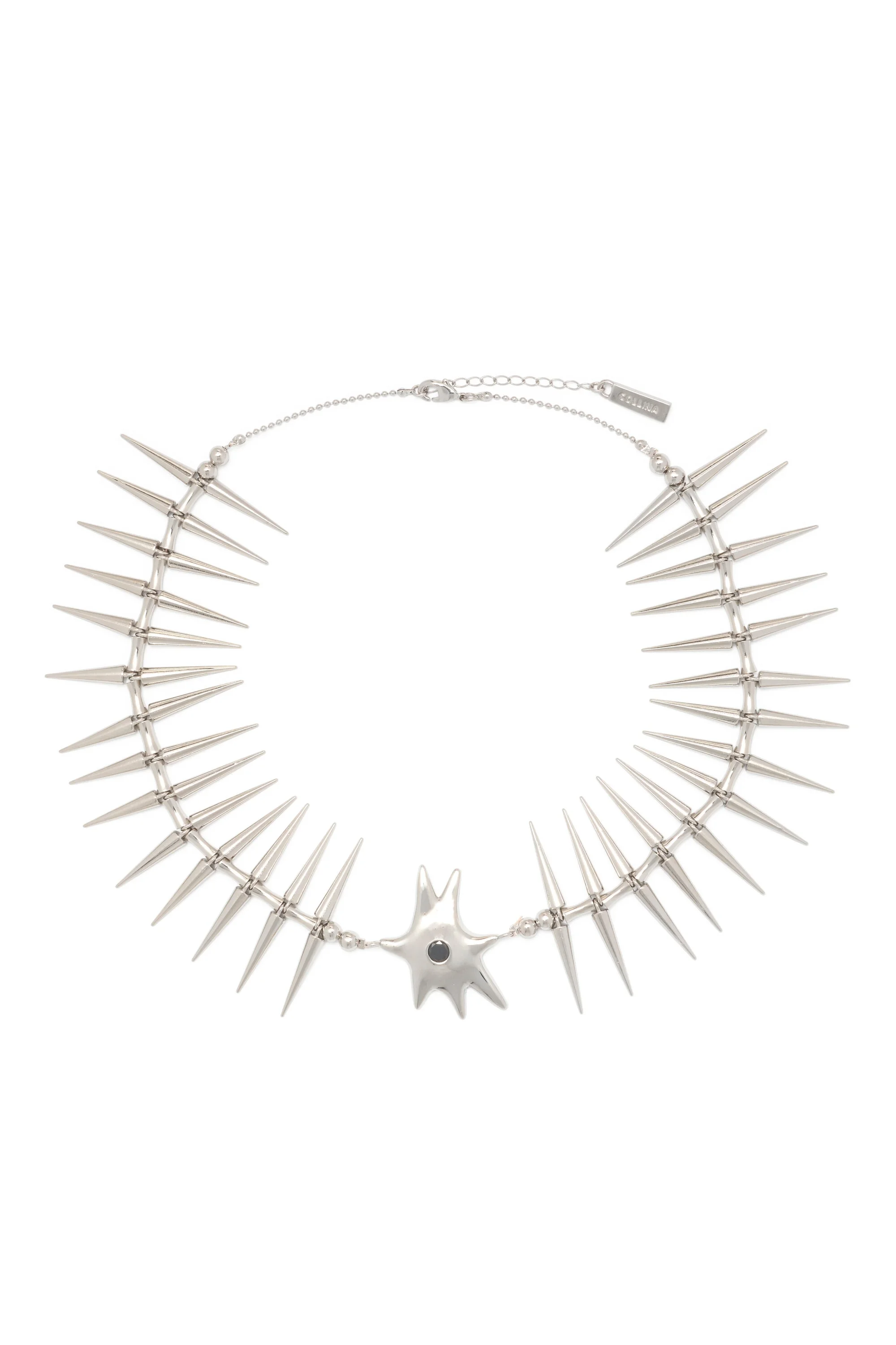 Necklace with spiky details and mini single star with jet black gem. Adjustable Length. Measures 17 - 19 cm This is a costume jewelry piece. Please use care with this item and do not wear while bathing or swimming. Excessive wear may cause the finish to deteriorate. Jewelry bag handmade with fabric scraps from our NY studio. Each jewelry bag is one of a kind.
