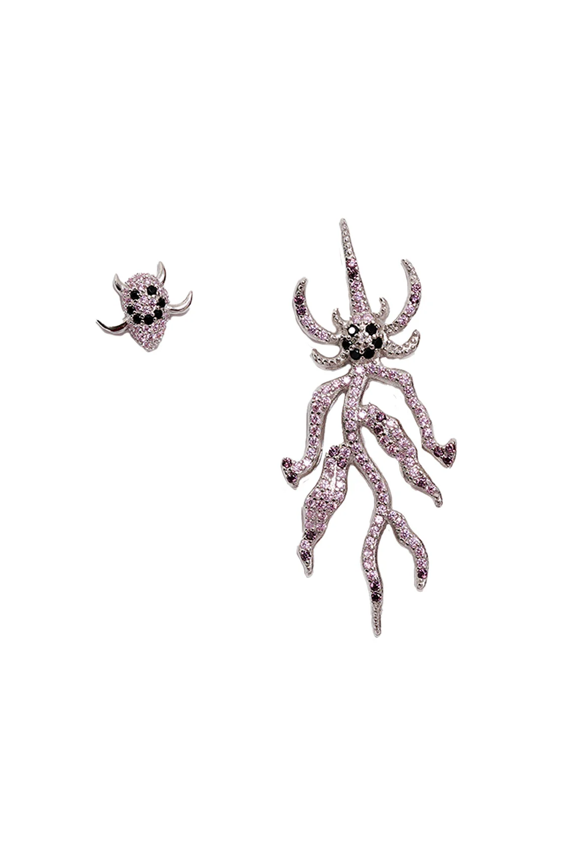 Sterling silver mixed pair spike monster earring encrusted in light rose and grape rhinestones. One large Spike Monster Earring and one Spike Monster Stud.Stud back. 5 x 2.5 cm & 1 x 0.70 cm 100% sterling silver and cubic zirconia Jewelry bag handmade with fabric scraps from our NY studio. Each jewelry bag is one of a kind.