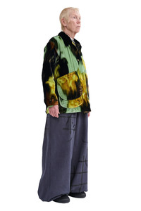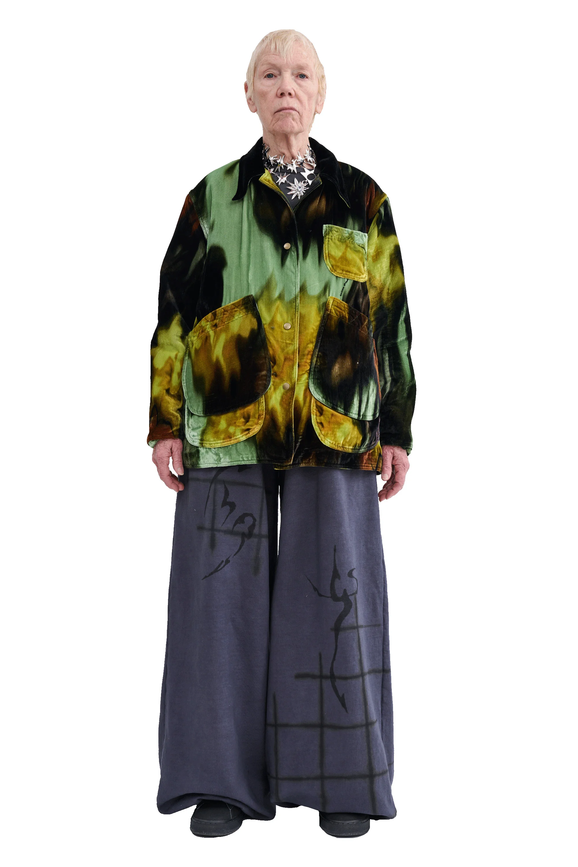 Printed velvet jacket with oversized double pockets. Snap closure. Classic barn coat silhouette. Deadstock corduroy collar. Fulled lined with quilted lining. Collina Strada’s AI generated Melting Bloom print. 20% viscose 80% nylon, 100% deadstock cotton, and 100% polyester Model wears size Small Made in New York - Oversize fit - XS=00-0, S=2-4, M=4-6, L=6-8, XL=10-12. Print placement may vary