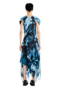 Long dress with structured cap sleeves and ruffles. Asymmetrical hem. Collina Strada’s custom Navy Melting Bloom print. Bias cut rose sylk body with lightweight chiffon ruffles. 100% Rose Sylk and 100% Silk - Round neck - Structured cap sleeves - Piping at chest - Ruffles at handkerchief hem - Hook-eye fastening at back collar Made in USA Model wears a size Small Print placement may vary True to size XS=0, S=2-4, M=6-8, L=8-10
