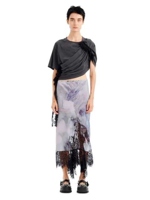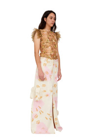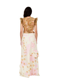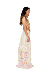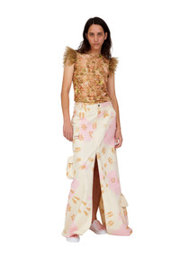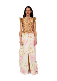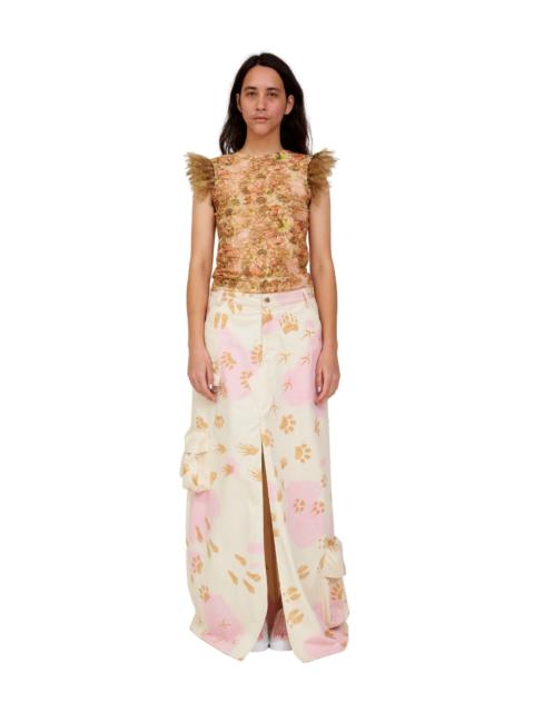 Floor length denim cargo skirt with front slit. Printed all over with animal paw prints. Fly front. 100% Cotton Made in New York Model wears a small. Print placement may vary.