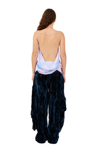 Spaghetti strap top with deep cowl back. Fully lined front. 78% Acetate 22% Polyester Model wears size Small Model height : 5’5’’ Model waist : 23'' 1/2 Model hips : 35’’ Made in New York - True to size. - XS=00-0, S=2-4, M=4-6, L=6-8, XL=10-12.