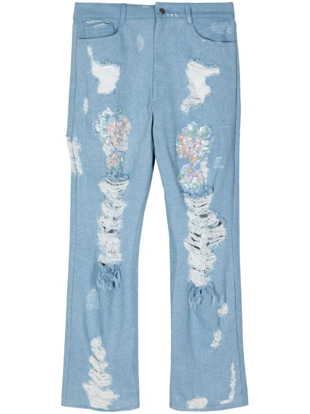 sequin-detail distressed jeans Highlights - Blue - Cotton - Denim - Distressed finish - Sequin embellishment - Mid-rise - Concealed fly and button fastening - Classic five pockets - Straight leg Imported Composition Cotton 100%