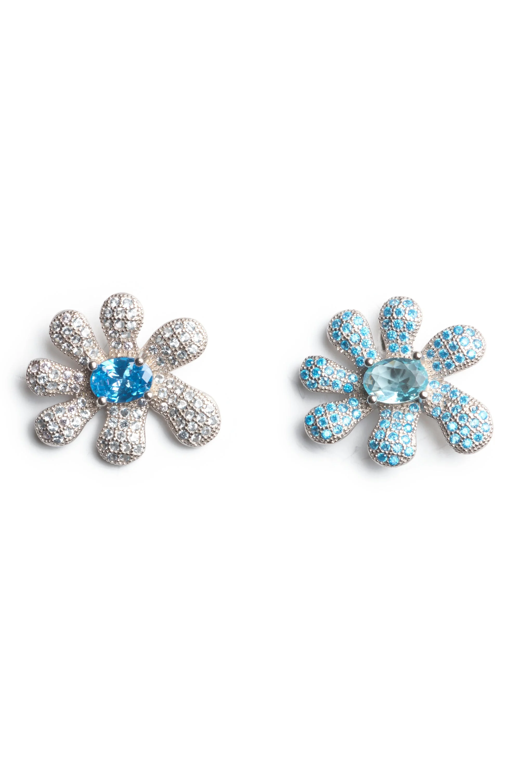 Sterling silver flower blossom, mismatched pair, encrusted with rhinestones. Stud back. 2 x 2.5 cm 100% Sterling Silver and Cubic Zirconia Made in China Jewelry bag handmade with fabric scraps from our NY studio. Each jewelry bag is one of a kind.