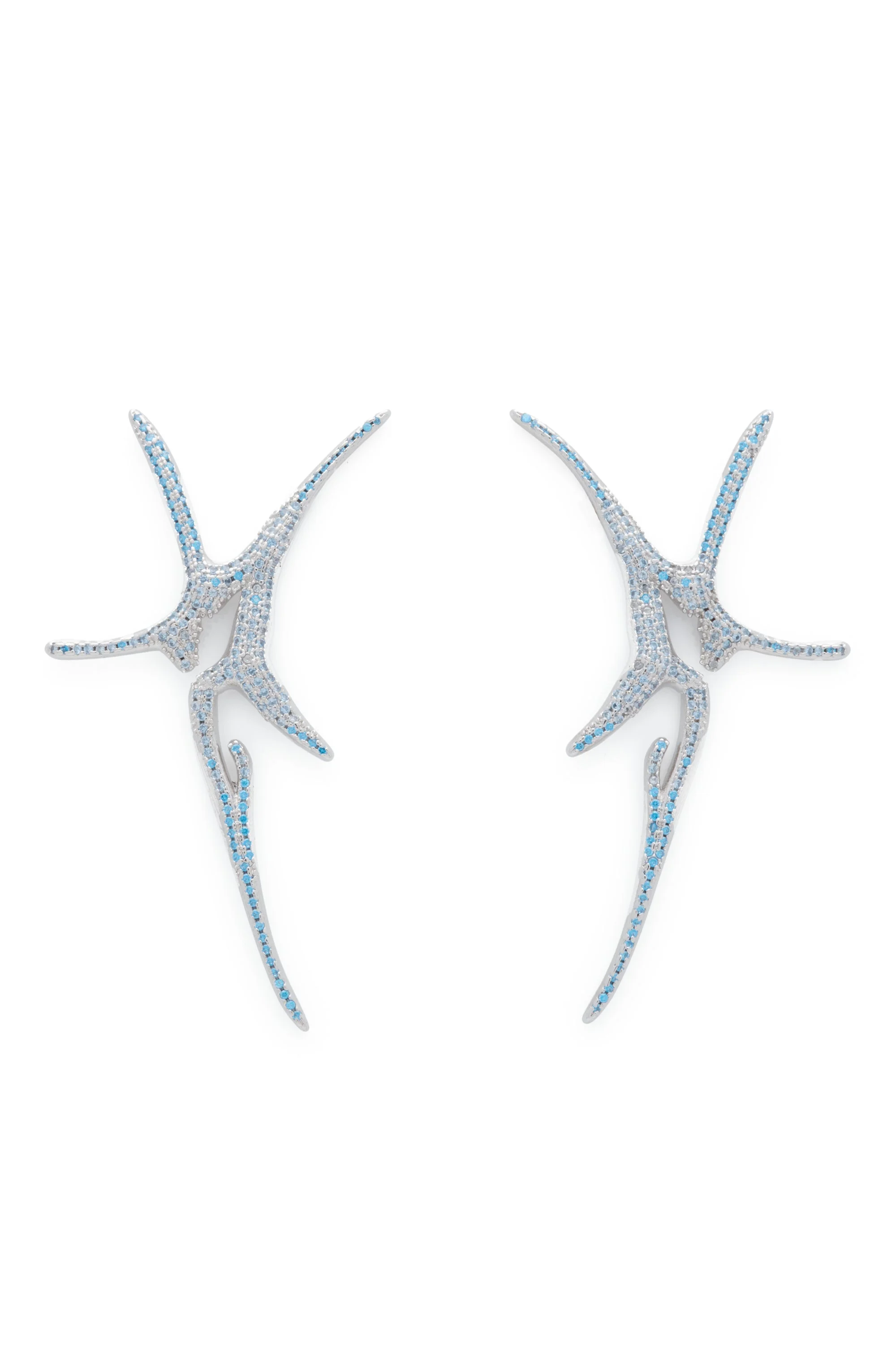 Delicate crystal pave stud earrings in an organic star shape. Stud back.Sterling silver and Swarovski crystals Sterling silver and crystal rhinestones. 60 x 30 mm Jewelry bag handmade with fabric scraps from our NY studio. Each jewelry bag is one of a kind. This is a costume jewelry piece. Please use care with this item and do not wear while bathing or swimming.