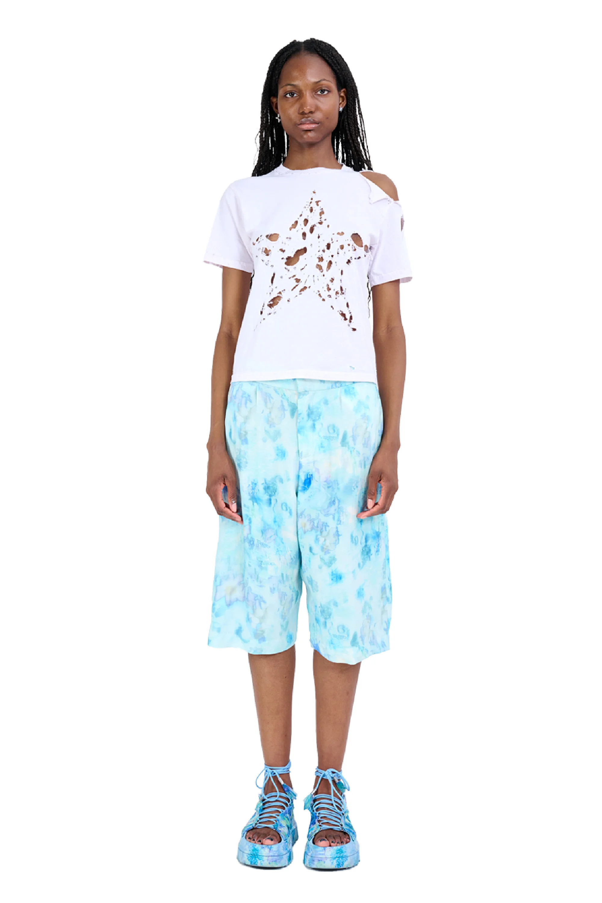 Relaxed fit mid-rise short with draped leg. Collina Strada's AI-generated Sky Shadow Floral print. 100% Viscose Made in New York Model wears a size Small. - True to size. - XS=00-0, S=2-4, M=4-6, L=6-8, XL=10-12. Print placement may vary