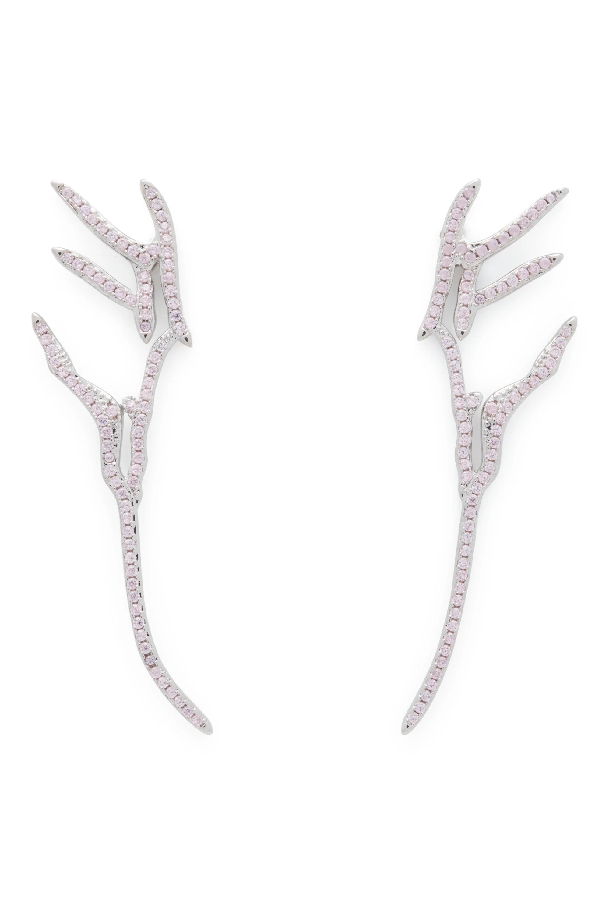 Delicate crystal pave stud earrings in an organic wing shape. Stud back.Sterling silver and Swarovski crystals Brass and crystal rhinestones. Sterling silver post. 60 x 10 mm Shown on model in clear rhinestones. Jewelry bag handmade with fabric scraps from our NY studio. Each jewelry bag is one of a kind. This is a costume jewelry piece. Please use care with this item and do not wear while bathing or swimming.