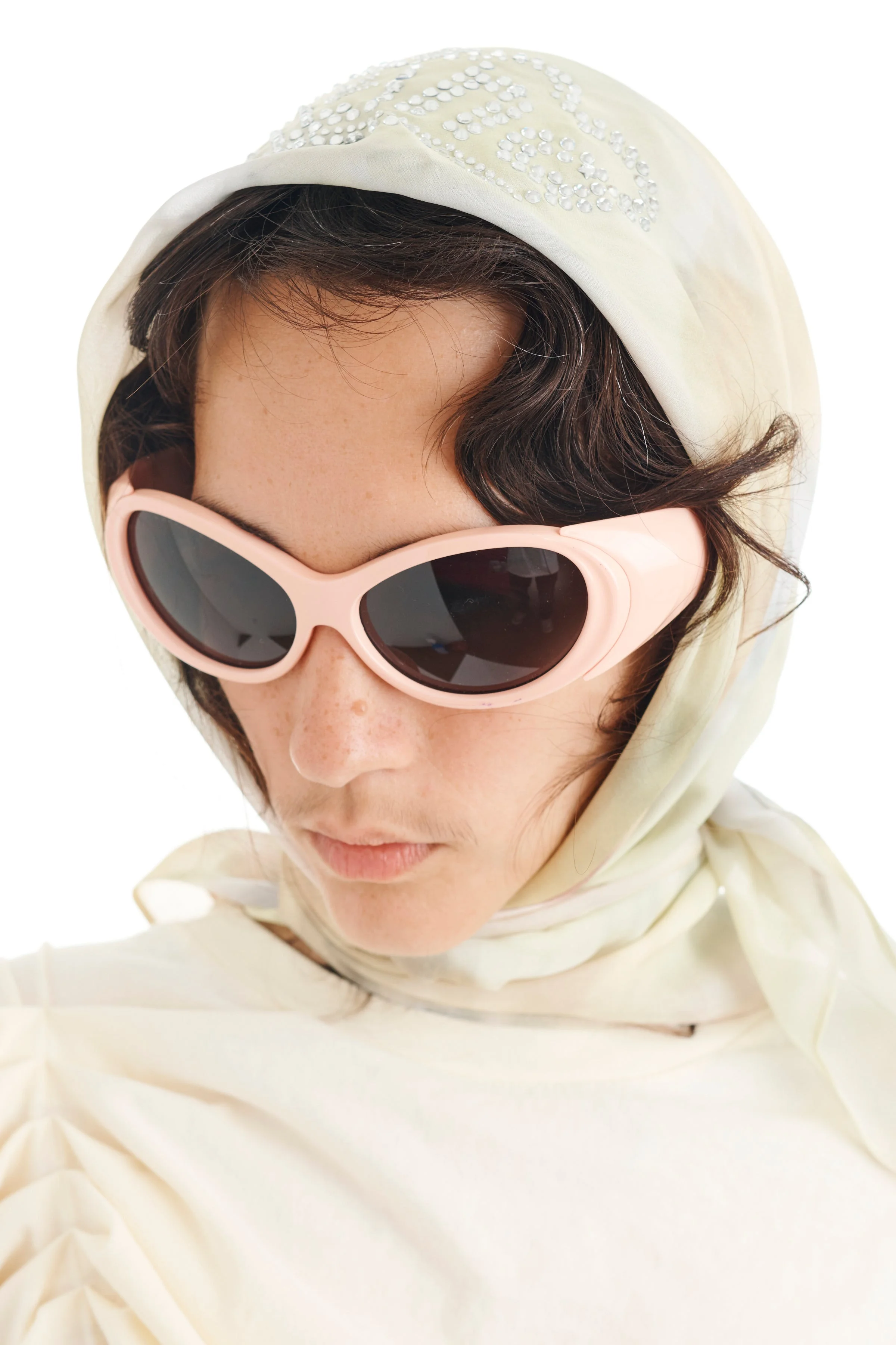 Washed Ocean Flowers print silk chiffon scarf with custom Collina Tiara rhinestone design on the forehead. 100% Silk 36 in x 36 in Made in USA