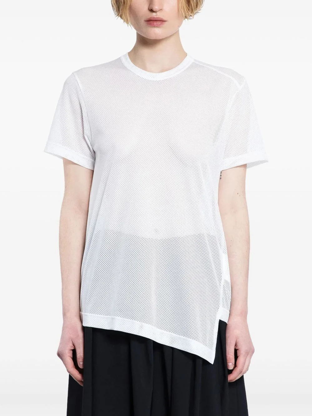 asymmetric T-shirt Highlights - White - Mesh design - Asymmetric hem - Short sleeves - Round neck Imported Composition Polyester 100% Washing instructions Read Manufacturer Guidelines