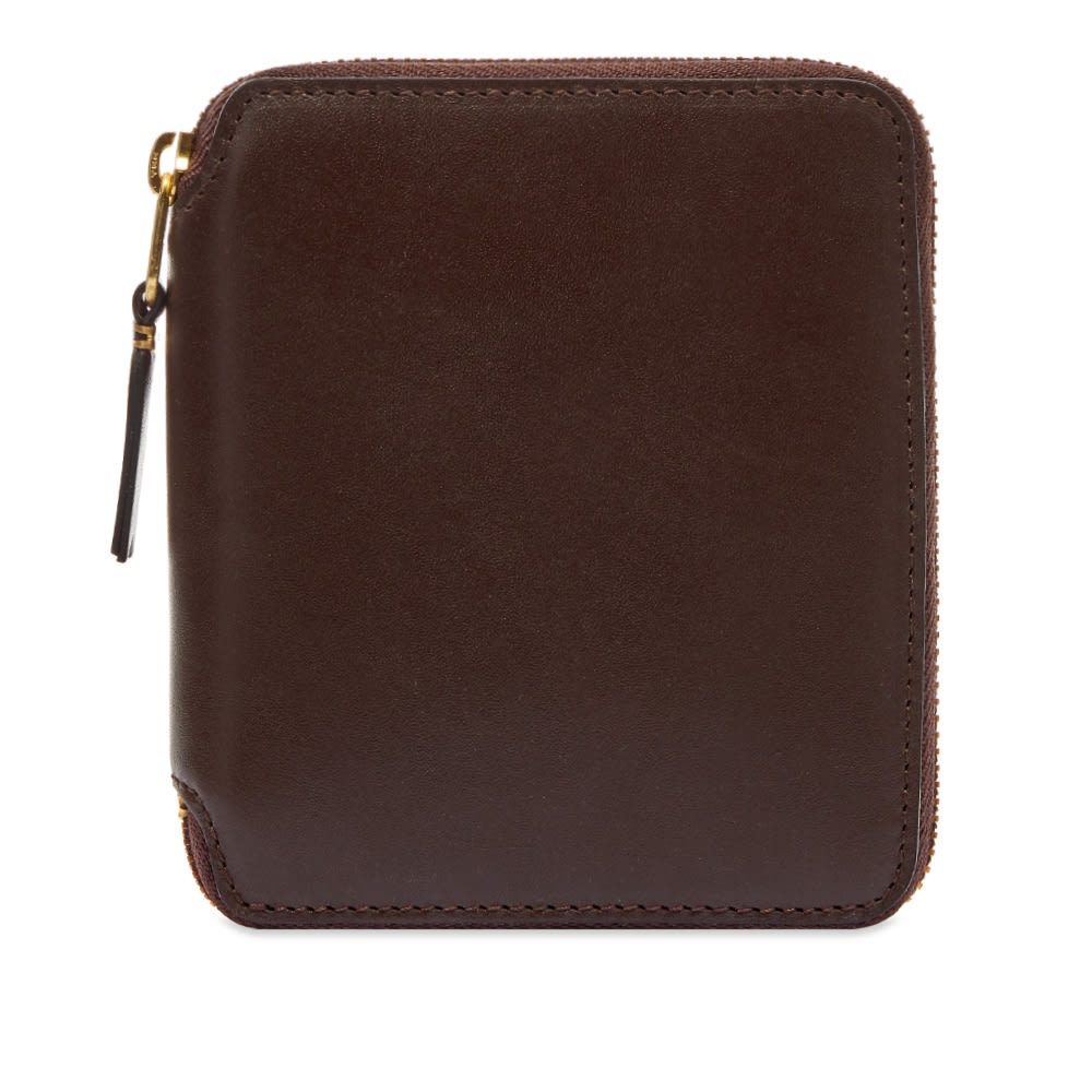 Smooth and rich like chocolate, this sleek wallet showcases Comme des Garçons' taste for luxury. Its cowhide construction is made using Spanish expertise, boasting precise tonal stitching to showcase its subtle grain. A wraparound zip fastening provides a bright gold finish to this premium accessory. - Cowhide Leather - Zip Closure - 4 Card Slots - Coin Pocket - Note Sleeve - Made in Spain