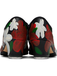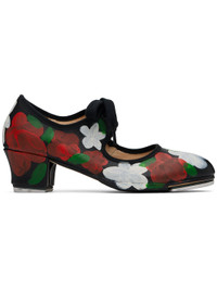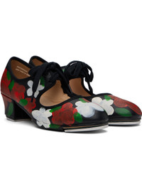 Buffed leather Mary Jane-style tap dance shoes in black. · Hand-painted floral pattern throughout · Lace-up strap at vamp · Logo stamp at padded footbed · Buffed leather lining · Covered block heel · Leather and textured rubber sole · T Pro Tap Tap #3 metal plaques at sole · Heel: H2" Supplier color: Black Upper: leather. Sole: leather, rubber, metal. Made in China 251245F121001