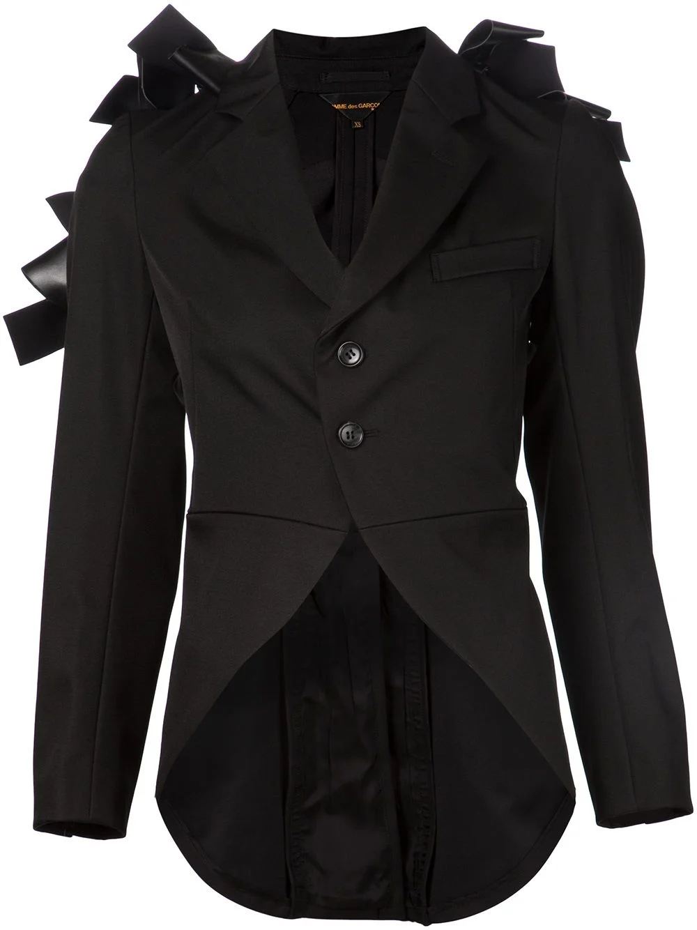 bow blazer jacket Black wool blend bow blazer jacket from Comme Des Garcons. Imported Composition Wool 58%, Shell 42% Lining: Polyester 100%