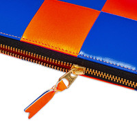 Sure to make a statement, this Comme des Garçons SA0110 wallet arrives in a fluorescent blue and orange checkerboard print. Crafted in Spain from premium goatskin, its glossy build is fastened with a gold-tone zipper, then equipped with a multitude of handy pockets. - Goat Leather Construction - Zip Closure - 6 Card Slots - 2 Note Sleeves - Coin Compartment - Made in Spain