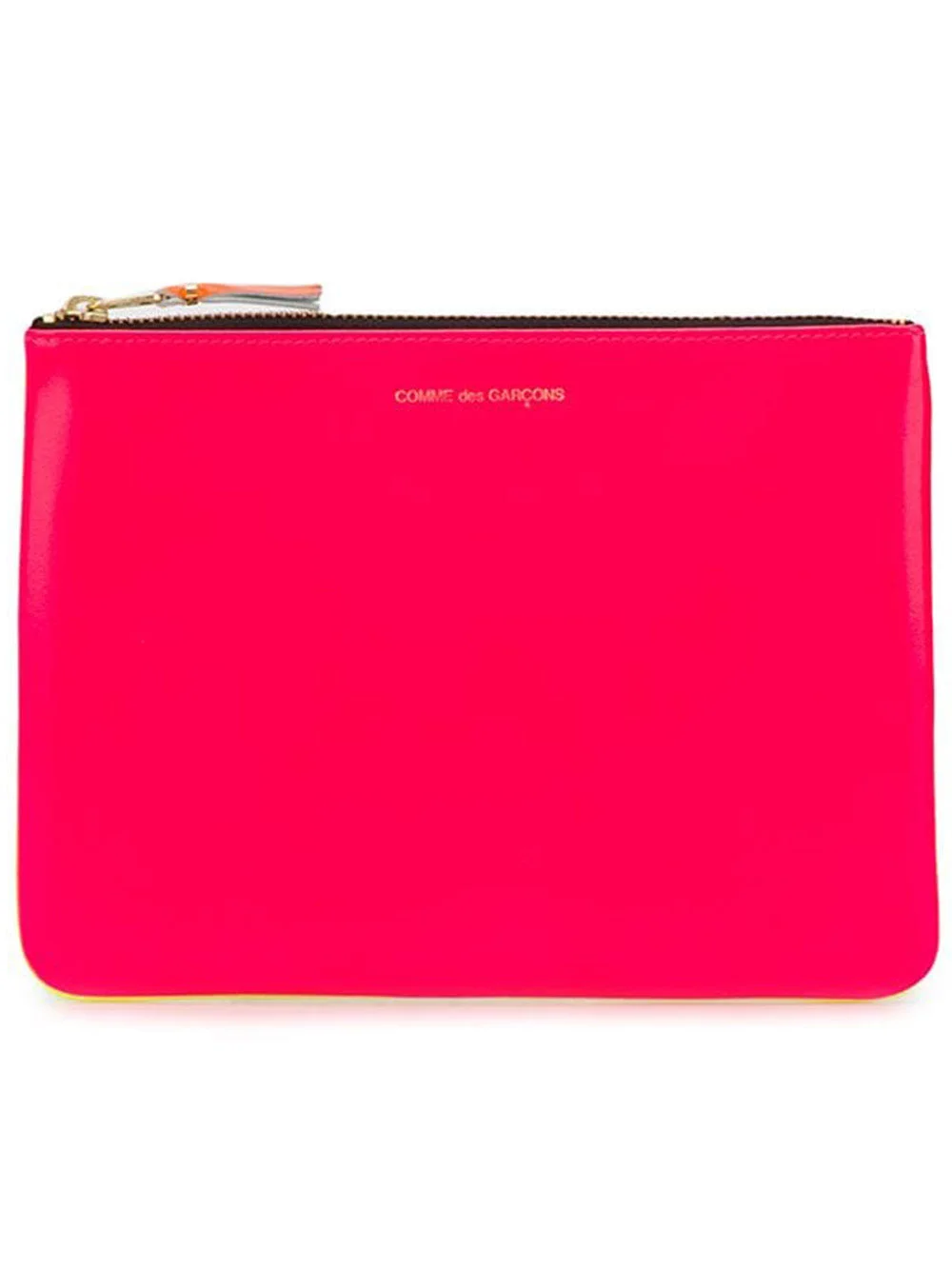 SA5100SF Super Fluo Wallet in Pink/Yellow from Comme des Garcons Wallet Highlights - neon pink/yellow - colorblock - leather - logo stamp - main compartment Made in Spain Composition: 100% Leather Designer ID: SA5100SF Measurements Length: 22 cm Width: 16 cm Thickness: 1.5 cm Materials 100% Cowhide For surface stains, we recommend wiping with a damp cloth.