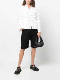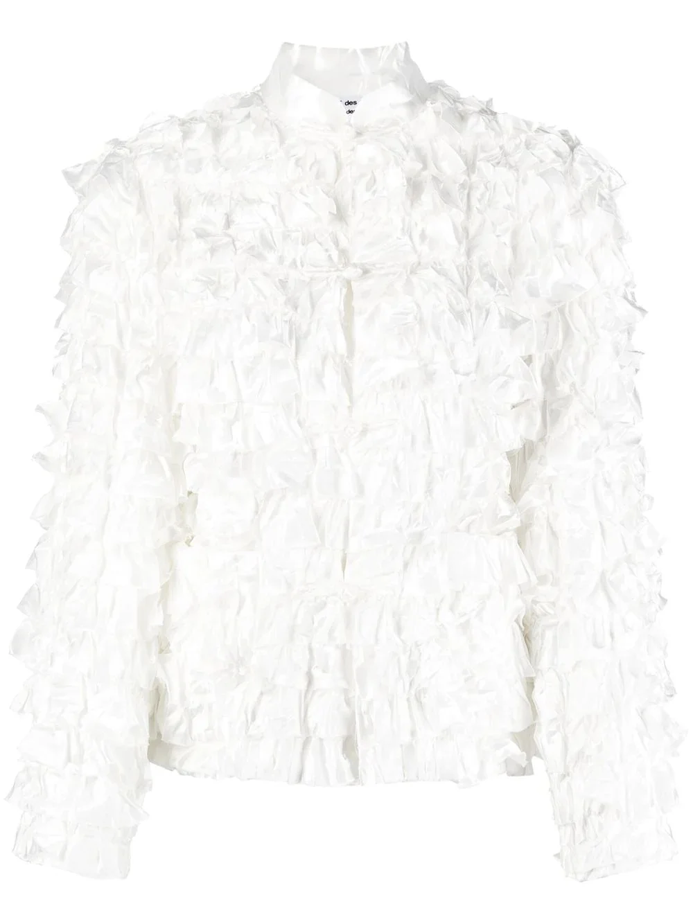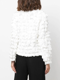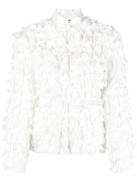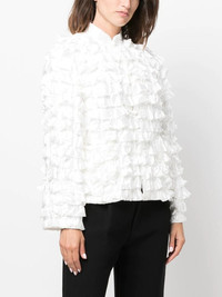 band-collar ruffled fitted jacket white ruffled detailing band collar concealed front fastening long sleeves straight hem Imported Composition Polyester 100% SIZE & FIT Model measurements Height 5 ft 9 in(1.74 m) Bust/Chest 32.28 in(82 cm) Hips 35.82 in(91 cm) Waist 24.01 in(61 cm) FittingInformation This piece fits true to size. We recommend you get your regular size Cut for a loose fit Made with a mid-weight non-stretch fabric Washing instructions Machine Wash