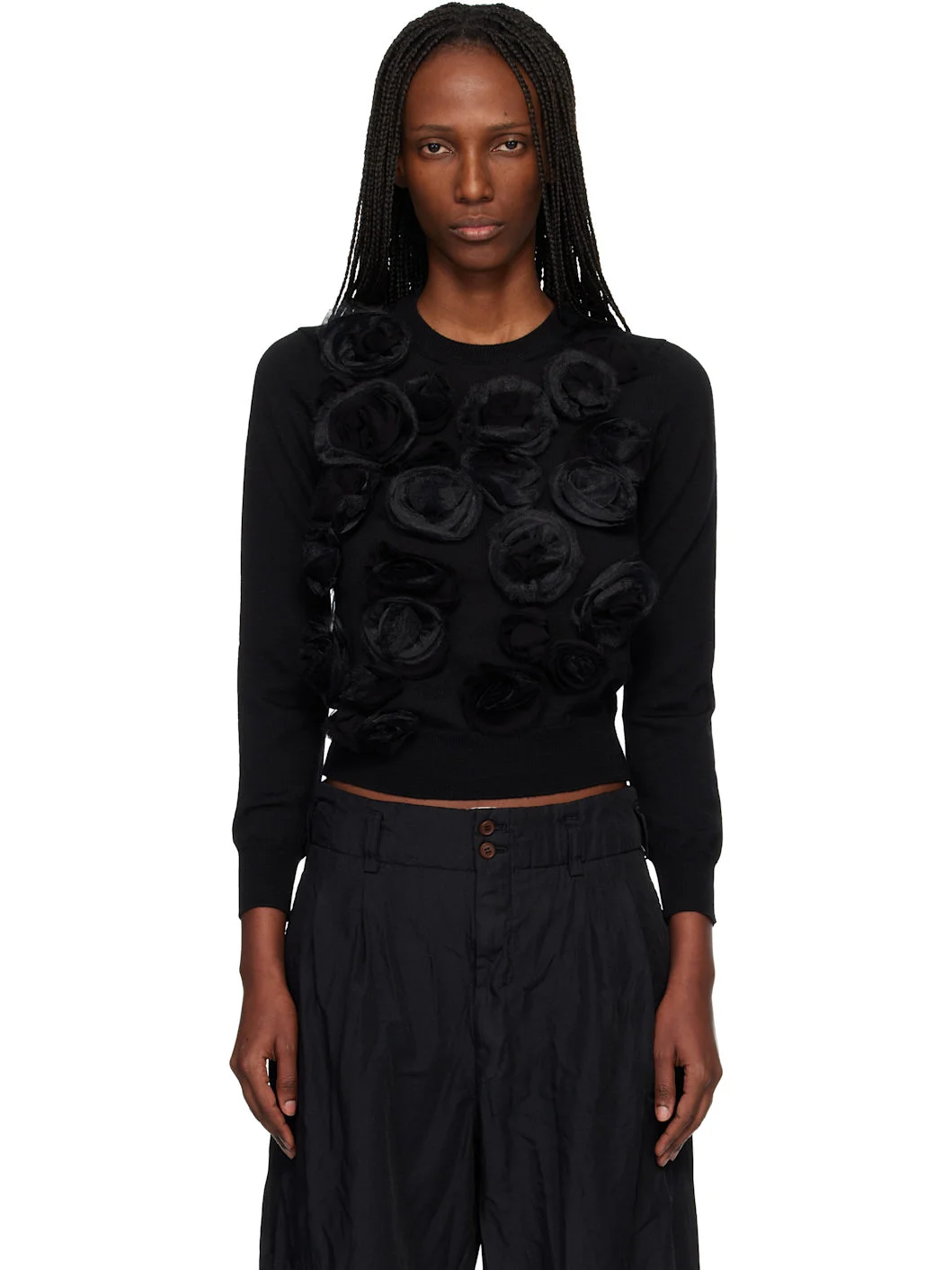 Knit wool sweater. · Rib-knit crewneck, hem, and cuffs · Floral appliques at front Supplier color: Black Body: 100% wool. Trim: 77% polyester, 23% nylon. Made in Japan 261671F096001