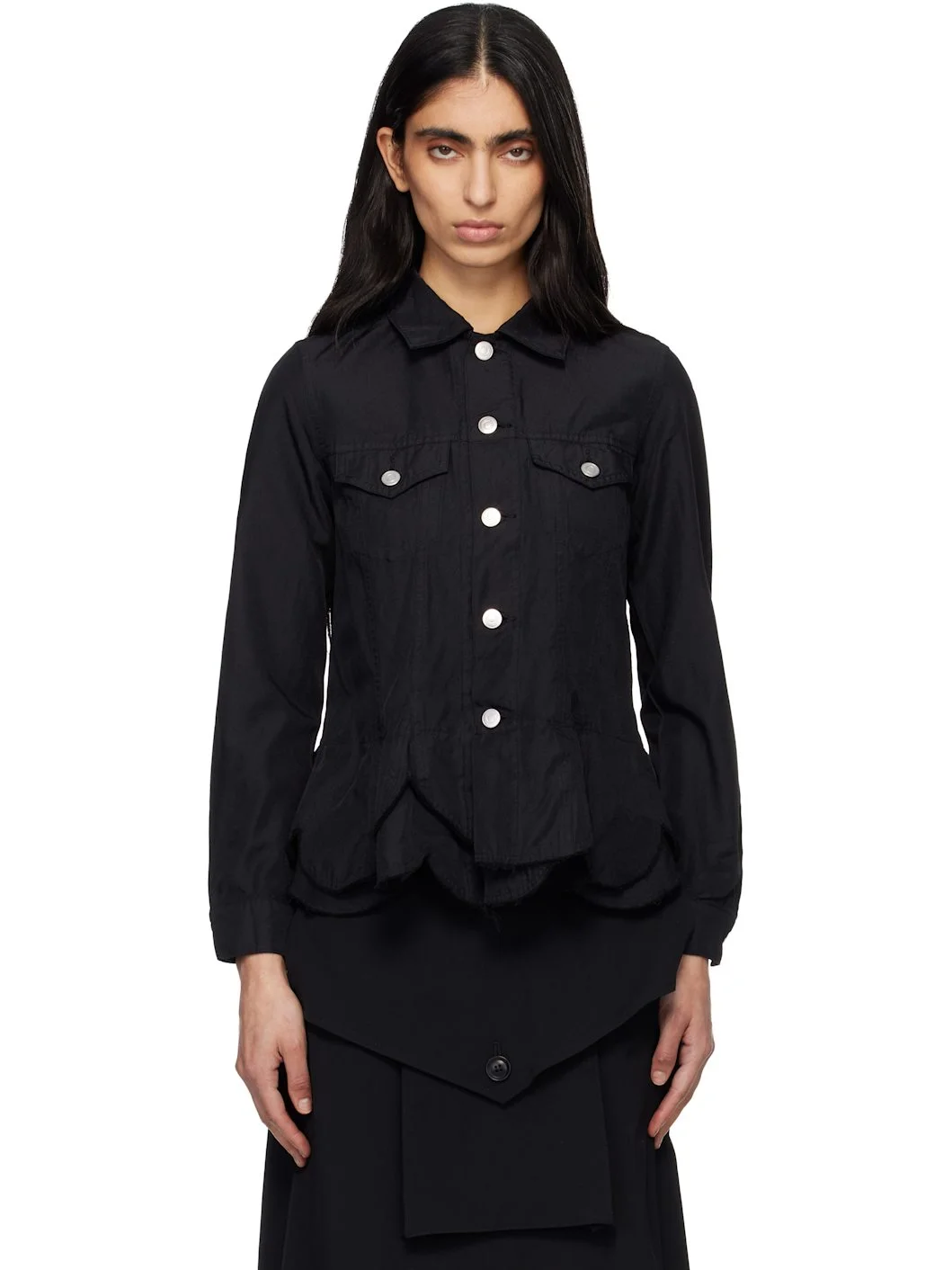 Crinkled lightweight twill jacket. · Spread collar · Button closure · Flap pockets at chest · Scalloped and layered hem · Peplum hem · Buttoned barrel cuffs · Unlined Supplier color: Black 100% polyester. Made in Japan 261671F063002
