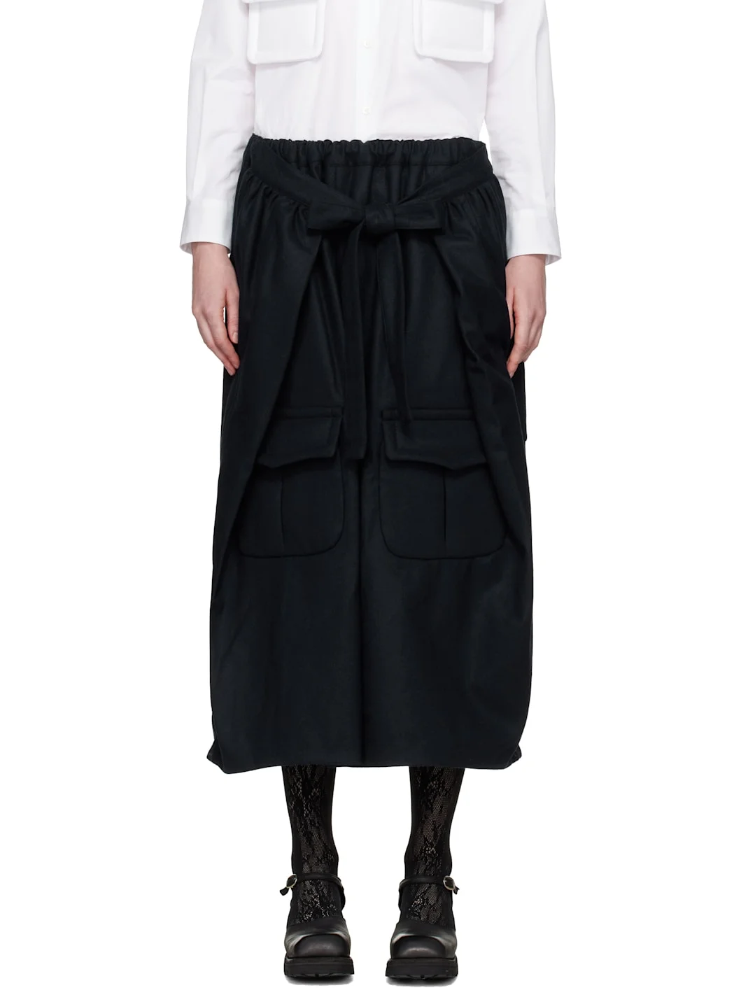 Wool- and nylon-blend broadcloth trousers. · Wrap construction · Self-tie fastening at front · Drawstring at elasticized waistband · Three-pocket styling · Flap pockets at legs Supplier color: Navy Body: 90% wool, 10% nylon. Trim: 100% polyester. Made in Japan 252671F092005