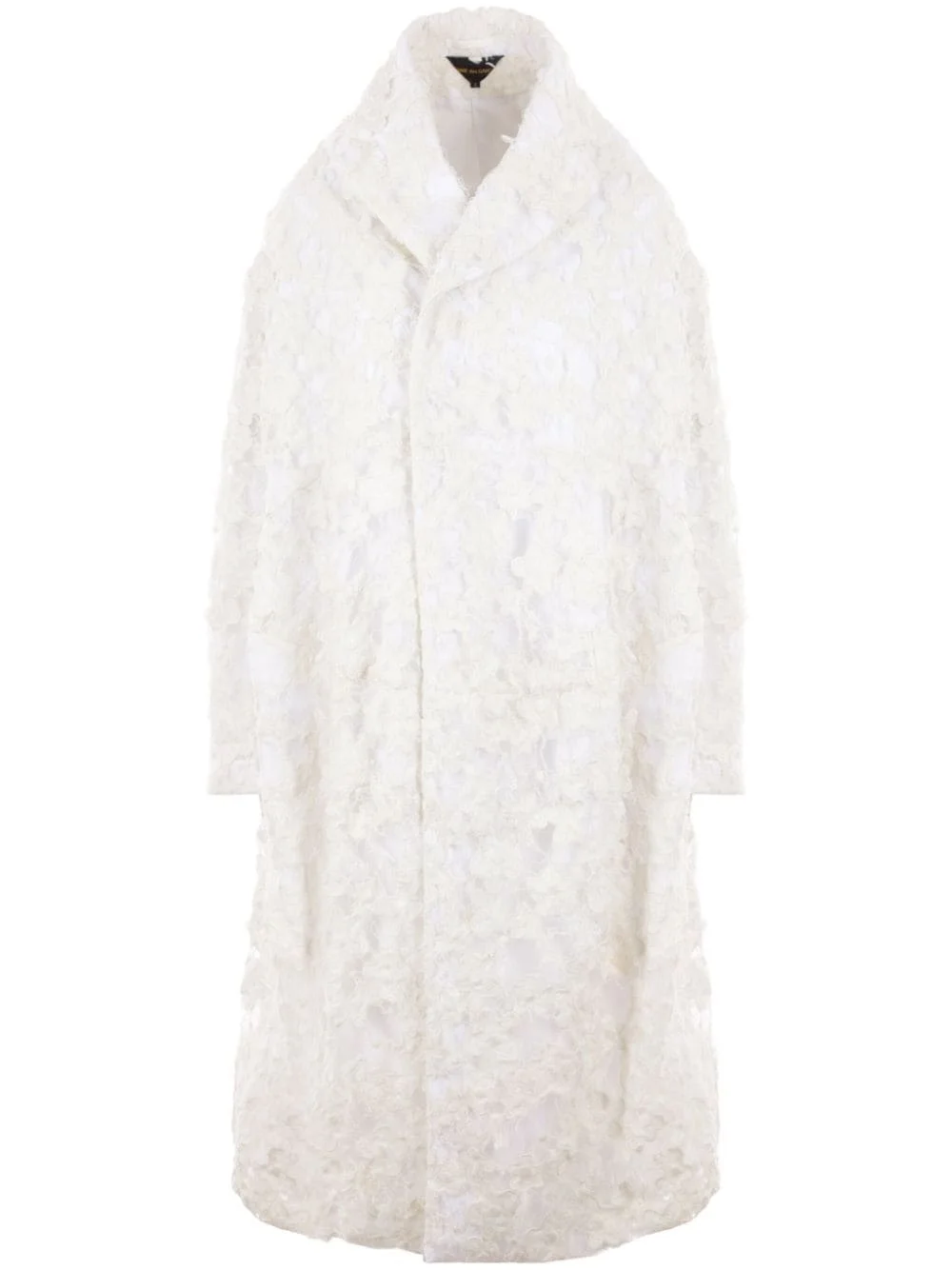 distressed-lace long coat Highlights - Off-white - Cotton blend - Lace detailing - Distressed effect - Wide notch lapels - Long sleeves - Straight hem - Concealed front fastening Imported Composition Cotton 93%, Elastane 7%