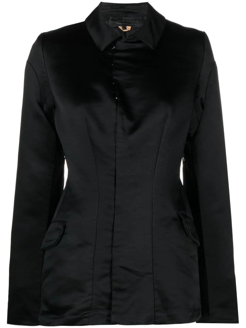 corset-style satin jacket Highlights - Black - Satin finish - Corset style - Eyelet embellishment - Spread collar - Front hook and eye fastening - Long sleeves - Cuff zips - Two side flap pockets - Straight hem - Partial lining Imported Composition Lining: Polyester 100% Outer: Polyester 100% SIZE & FIT Model measurements Height 5 ft 10 in(1.78 m) Bust/Chest 30.7 in(78 cm) Hips 36.22 in(92 cm) Waist 25.59 in(65 cm) FittingInformation Designed for a slim fit that sits just away from the body offering a close yet comfortable fit The vented hem offers movement at the rear Made from a midweight non-stretch fabric This piece fits true to size – take your usual size Washing instructions Machine Wash