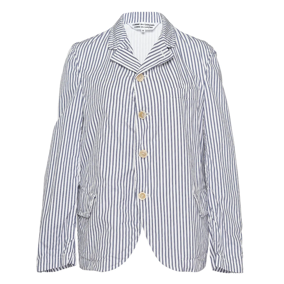 600080983LBL00M / RQ-J018/051/1/2A - Premium cotton broadcloth construction - Vertical navy and white stripe pattern - Notched lapel collar - Asymmetrical front button closure - Four-button front fastening - Long sleeves with buttoned cuffs - Deconstructed tailoring - Relaxed fit through body COMME des GARCONS Cotton Broad Stripe Blazer delivers contemporary Japanese design with architectural tailoring and unconventional construction. Crafted from premium cotton broadcloth featuring distinctive vertical pinstripe pattern in navy and white, with signature asymmetrical button closure. The deconstructed silhouette and avant-garde proportions showcase the brand's innovative approach to wardrobe essentials.