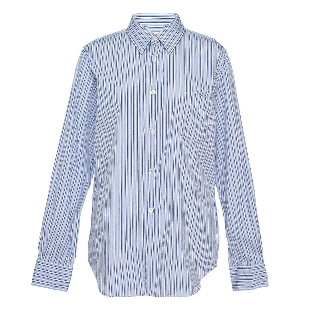 600080962LBL00L / RQ-B006/051/1/2A - Premium cotton broadcloth construction - Multi-tonal blue and white stripe pattern - Classic point collar - Long sleeves with button cuffs - Front button placket - Relaxed tailored fit - Chest pocket detail COMME des GARCONS Cotton Broad Stripe Shirt delivers avant-garde sophistication with architectural precision and contemporary silhouette. Crafted from premium cotton broadcloth in multi-tonal blue and white stripes, featuring the brand's signature deconstructed tailoring approach. The structured collar and clean button placket showcase the label's commitment to refined minimalism with conceptual edge.