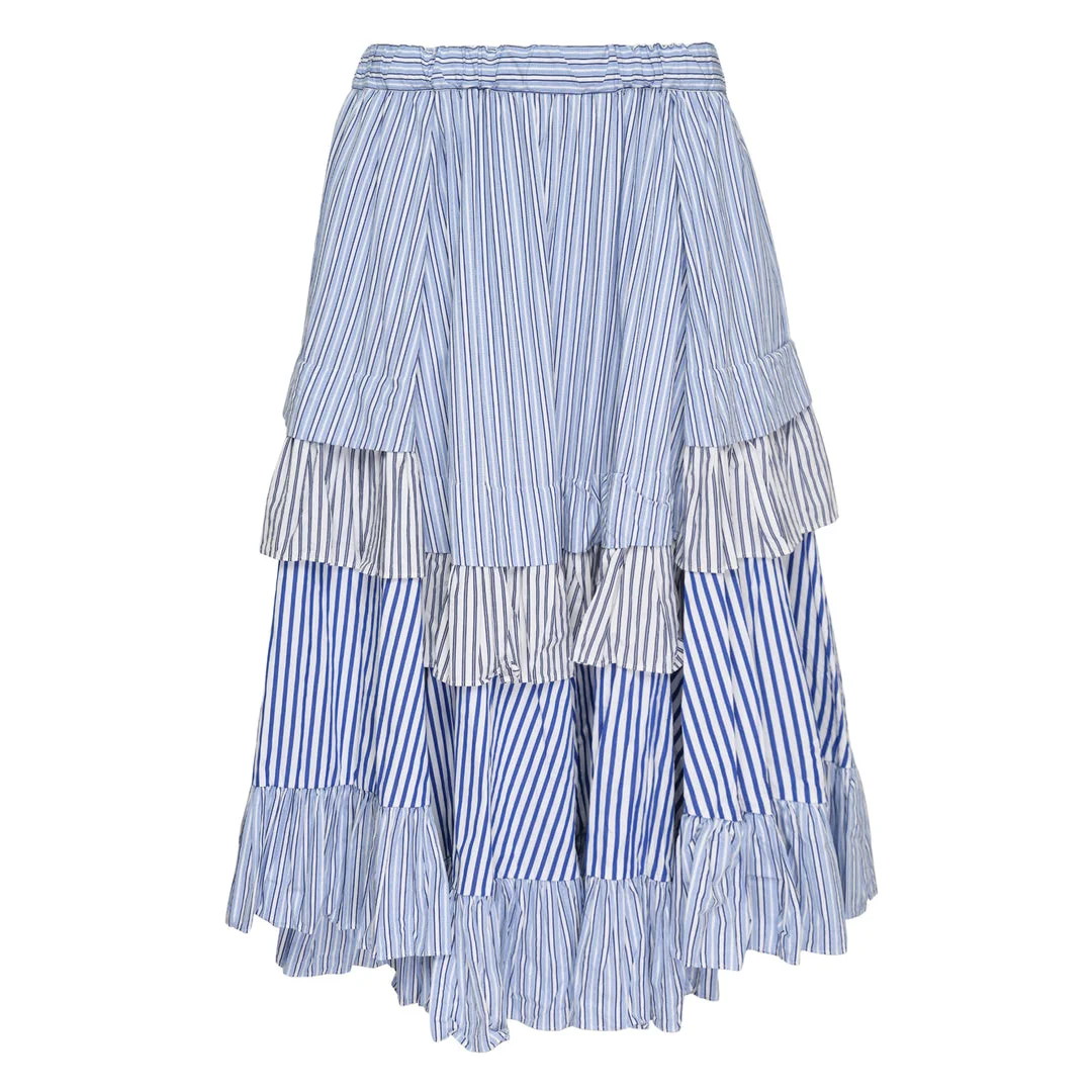 600081024BLU00L / RQ-S010/051/1/2A - Elasticated waistband with smocked detail - Three distinct stripe patterns in blue tones - Multiple tiered layers with ruffled edges - Asymmetrical hemline - Premium cotton poplin construction - Mixed stripe directions for visual interest - Relaxed A-line silhouette COMME des GARCONS Cotton Broad Stripe Skirt delivers avant-garde femininity with architectural construction and mixed pattern design. Crafted from premium cotton poplin featuring three distinct blue stripe patterns across multiple tiered layers with ruffled edges. The asymmetrical silhouette and signature COMME des GARCONS deconstructed aesthetic create a statement piece for contemporary wardrobes.