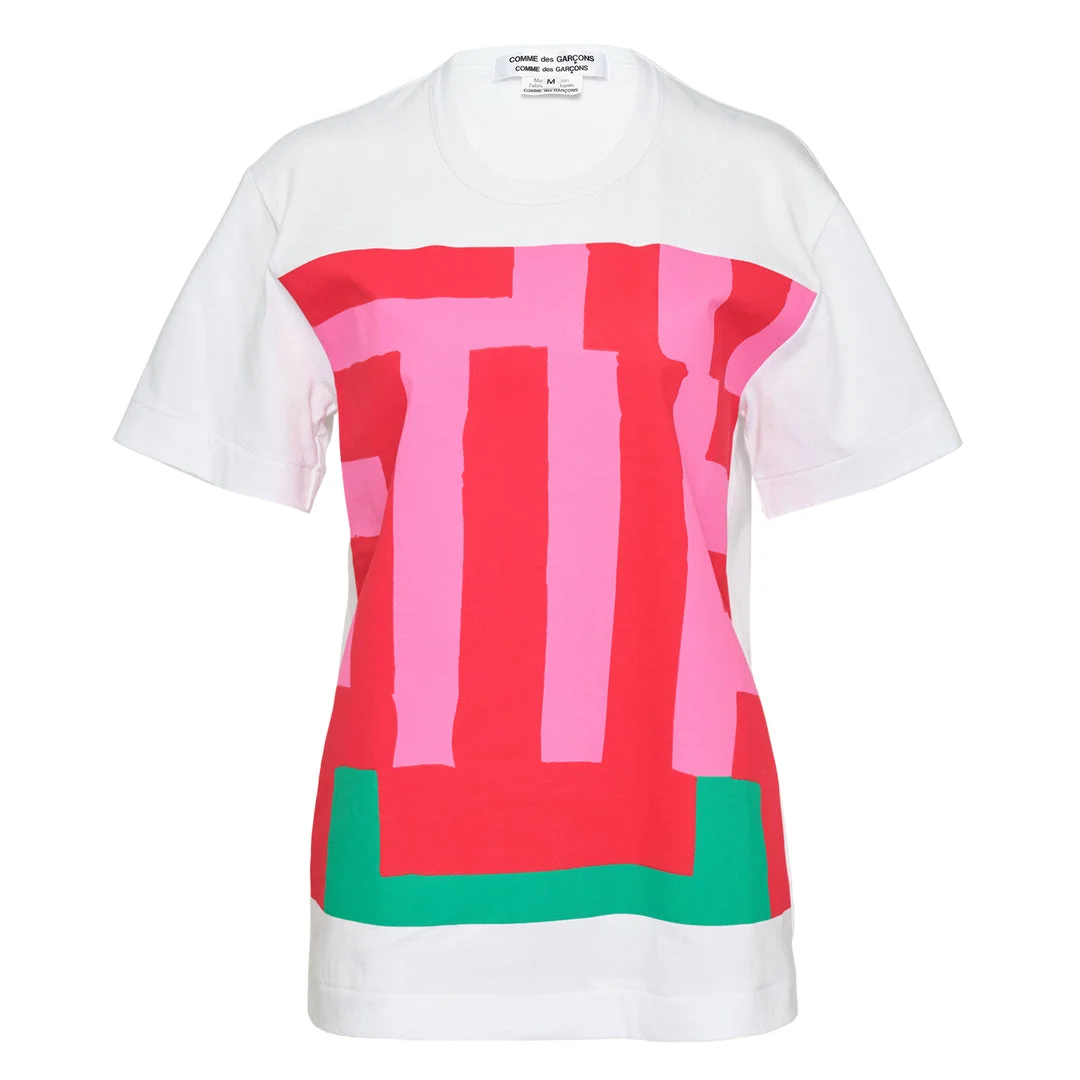 600081037WHT00L / RQ-T026/051/1/2A - 100% cotton jersey construction - Geometric color-block print design - Regular fit silhouette - Round crewneck collar - Short sleeves - Straight hem finish COMME des GARCONS Cotton Jersey Print T-Shirt delivers avant-garde style with bold geometric pattern placement and architectural design sensibility. Crafted from premium cotton jersey in crisp white base with striking red, pink and green color-blocking that creates an abstract dimensional effect. The signature CDG aesthetic transforms a classic silhouette into a contemporary statement piece with artistic pattern construction.
