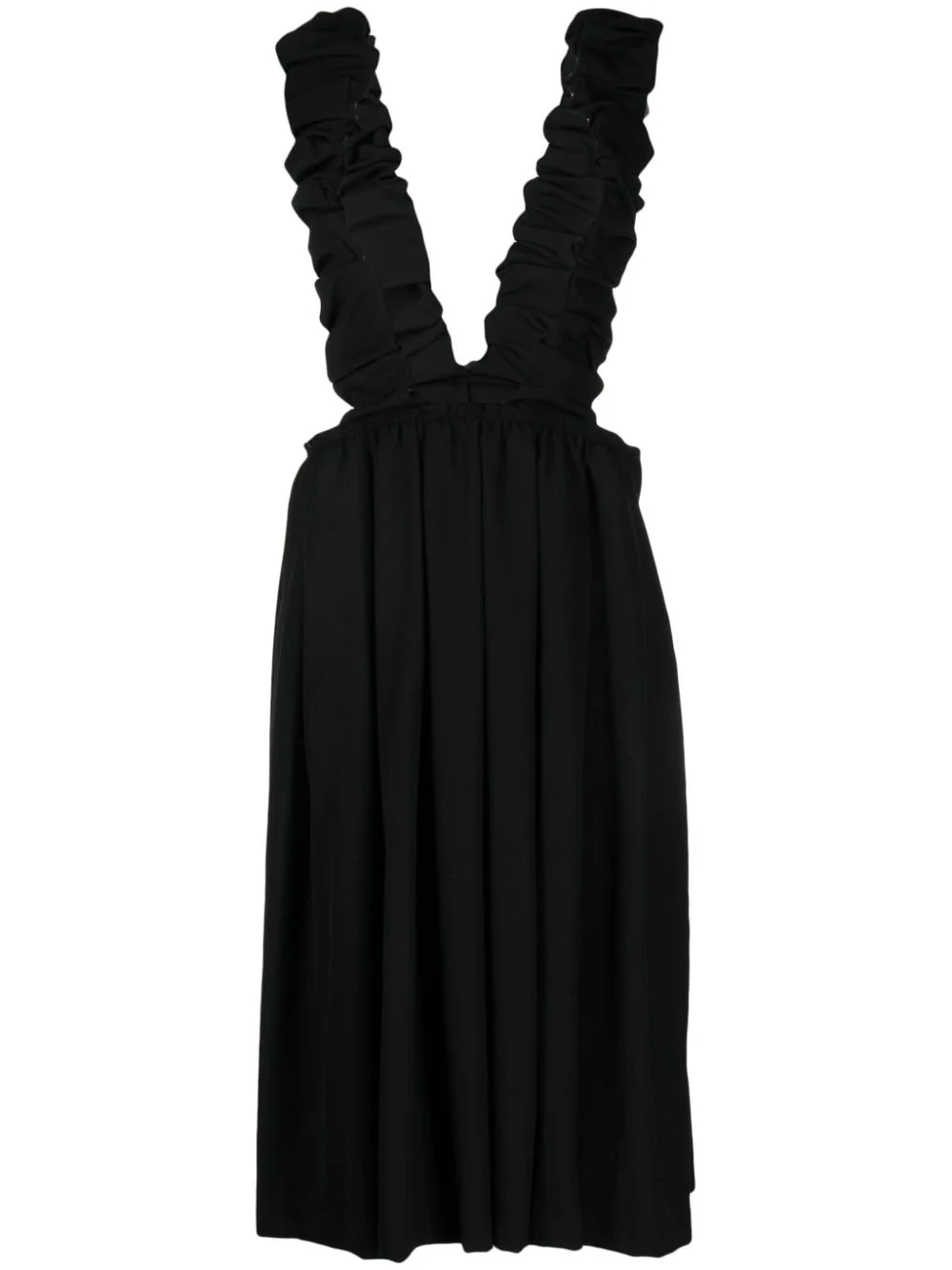 dungarees-style midi dress Highlights - Black - Wool - Ruffled detailing - Pleat detailing - Wide shoulder straps - Two side inset pockets - Below-knee length - Straight hem Imported Composition Wool 100% SIZE & FIT Model measurements Height 5 ft 10 in(1.77 m) Bust/Chest 31.49 in(80 cm) Hips 35.43 in(90 cm) Waist 25.19 in(64 cm) FittingInformation Designed to be unstructured, offering a loose fit throughout Made from a midweight non-stretch fabric This piece fits true to size – take your usual size