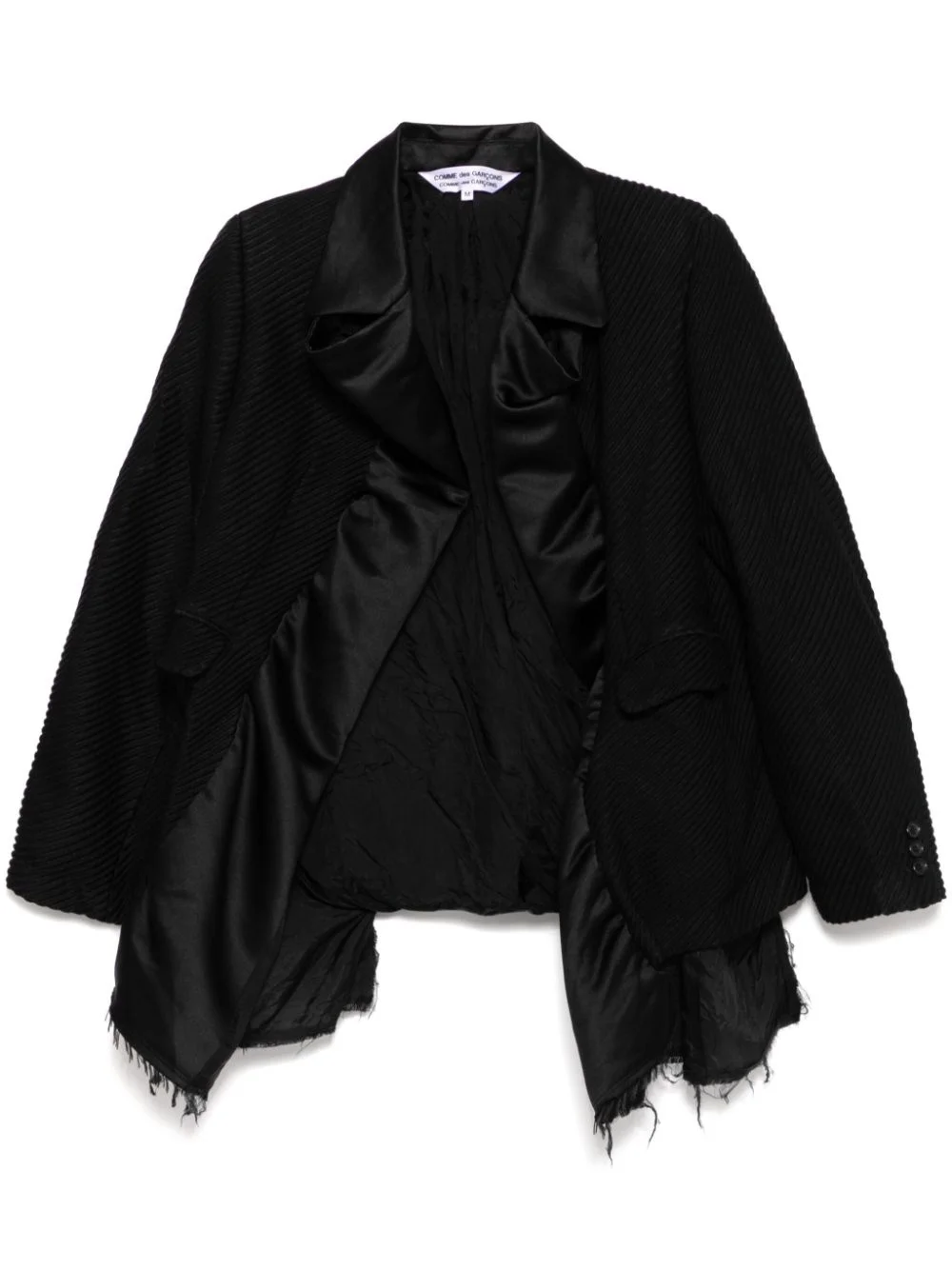fringed-edge blazer Highlights - Black - Wool blend - Open front - Contrasting-fabric design - Two front flap pockets - Long sleeves - Buttoned cuffs - Fringed edge - Asymmetric hem - Full lining Imported Composition Lining: Cupro 100% Outer: Wool 88%, Nylon 12% SIZE & FIT Model measurements Height 5 ft 9 in(1.76 m) Bust/Chest 31.1 in(79 cm) Hips 35.03 in(89 cm) Waist 24.4 in(62 cm) FittingInformation Designed to be unstructured, offering a loose fit throughout Made from a midweight non-stretch fabric