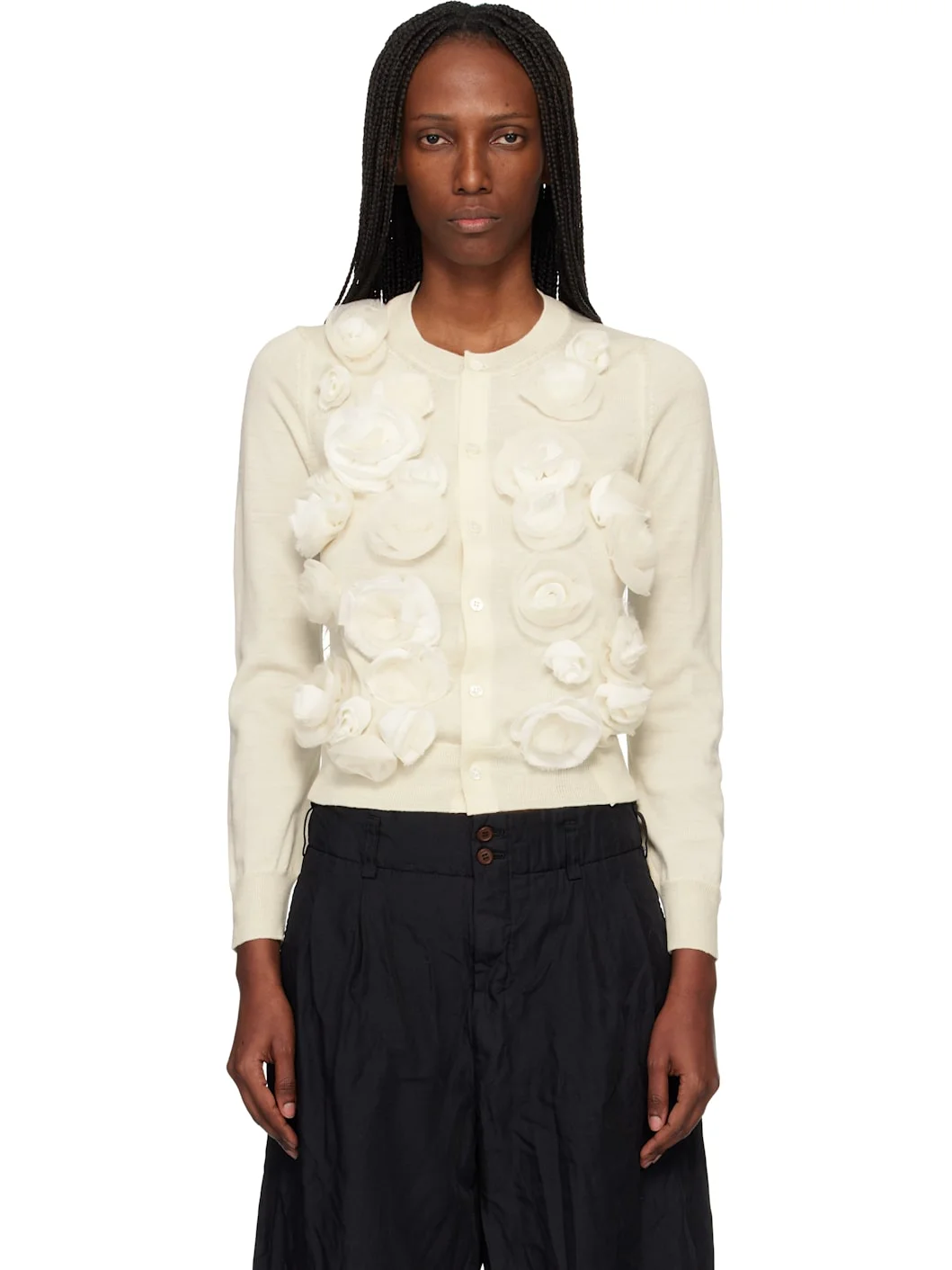 Knit wool cardigan. · Rib-knit crewneck, hem, and cuffs · Button closure · Floral appliques at front Supplier color: Off-white Body: 100% wool. Trim: 77% polyester, 23% nylon. Made in Japan 261671F095000