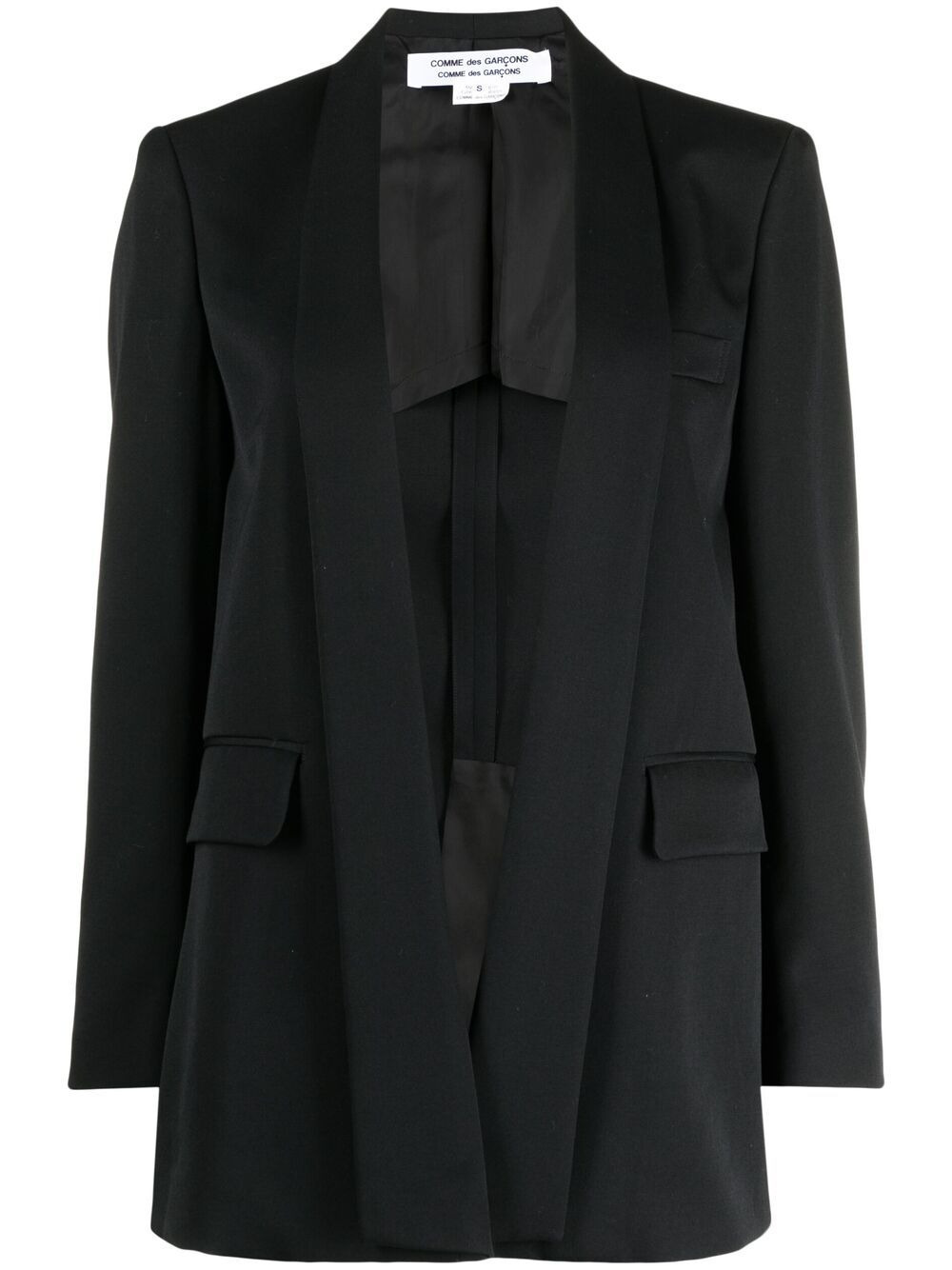 open-front wool blazer black wool shawl lapels no fastening long sleeves two side flap pockets central rear vent Imported Composition Lining: Cupro 100% Outer: Wool 100% SIZE & FIT Model measurements Height 5 ft 9 in(1.74 m) Bust/Chest 32.28 in(82 cm) Hips 35.82 in(91 cm) Waist 24.01 in(61 cm) FittingInformation This piece fits true to size. We recommend you get your regular size Cut for a loose fit Made with a mid-weight non-stretch fabric