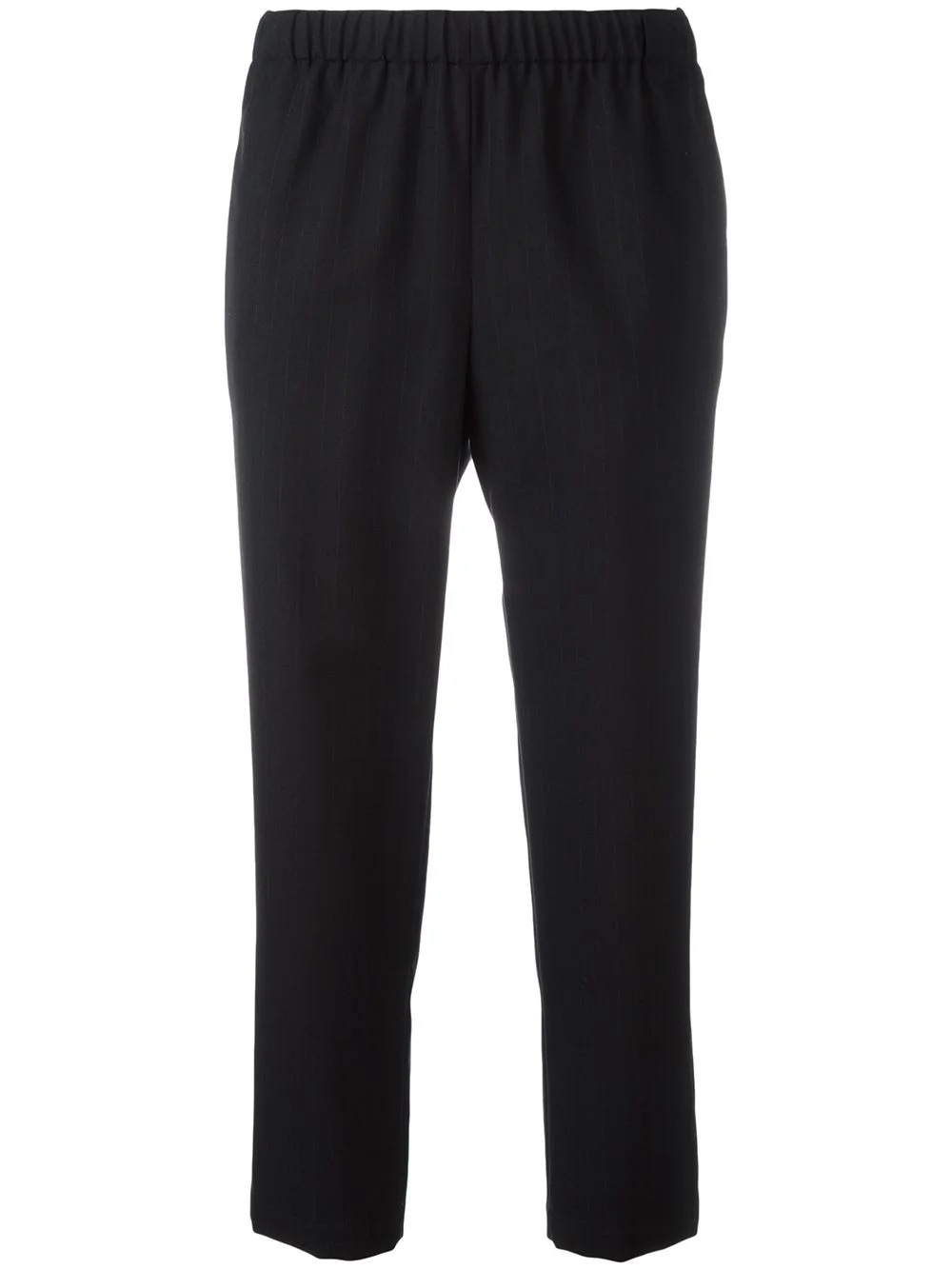 pinstriped cropped trousers Navy blue wool pinstriped cropped trousers from Comme Des Garcons Comme Des Garcons. Imported Composition Wool 100% SIZE & FIT Model measurements Height 5 ft 11 in(1.8 m) Bust/Chest 31.49 in(80 cm) Hips 35.82 in(91 cm) Waist 24.8 in(63 cm) Washing instructions Dry Clean Only