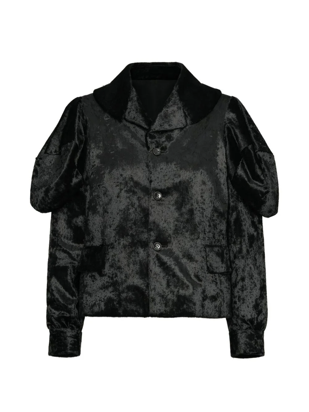 puff-sleeve cropped jacket Highlights - Black - Textured finish - Front button fastening - Spread collar - Front flap pockets - Puff sleeves Imported Composition Rayon 85%, Polyester 15% Washing instructions Read Manufacturer Guidelines