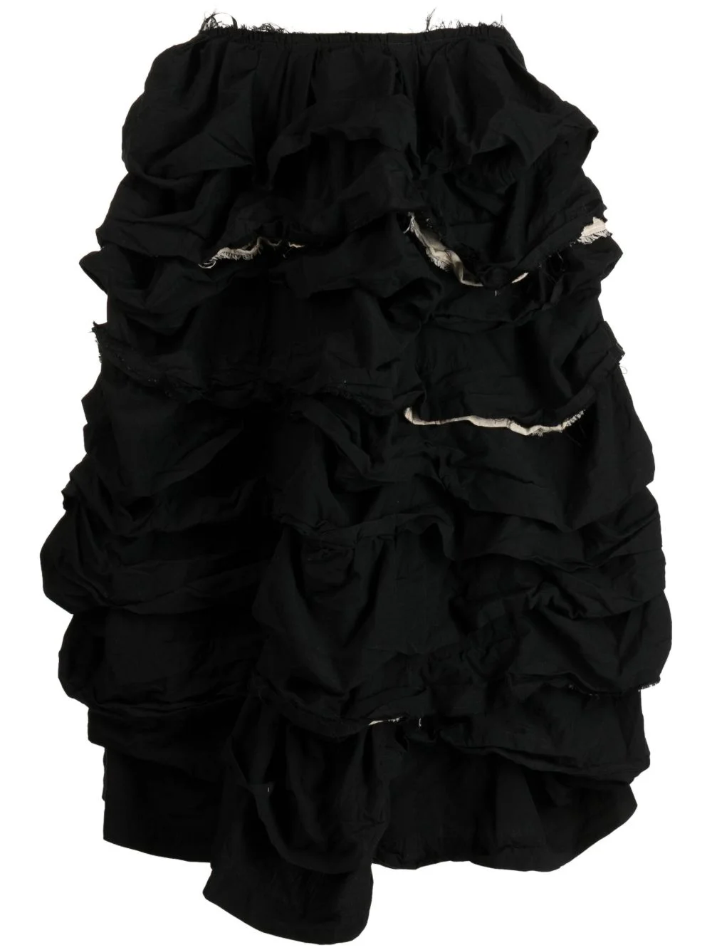ruffled-detail asymmetric skirt Highlights - Black - Ruffled detailing - Distressed effect - Elasticated waistband - Side slit pocket - Mid-calf length - Asymmetric design Imported Composition Polyester 100% SIZE & FIT Model measurements Height 5 ft 10 in(1.77 m) Bust/Chest 31.49 in(80 cm) Hips 35.43 in(90 cm) Waist 25.19 in(64 cm) FittingInformation This midi-length skirt is intended to be worn just below the waist Made from a midweight non-stretch fabric This piece fits true to size – take your usual size Washing instructions Dry Clean Only