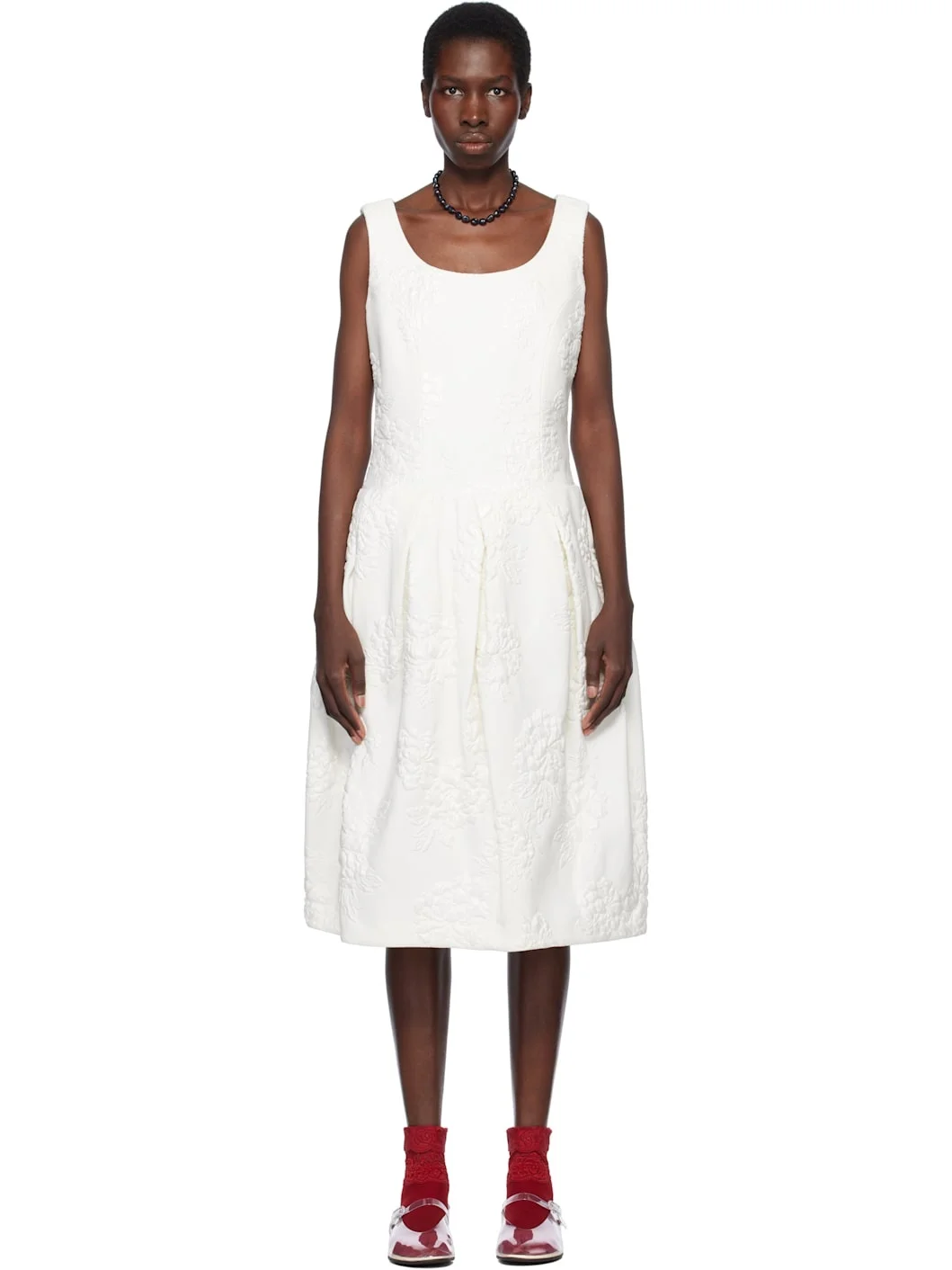 Nylon-blend matelasse midi dress. Jacquard floral pattern throughout. · Scoop neck · Princess seams at bodice · Pleats at waist · Seam pockets · Concealed zip closure at back · Full satin lining Supplier color: White Body: 75% nylon, 18% rayon, 7% silk. Lining: 100% cupra. Made in Japan 251671F054002