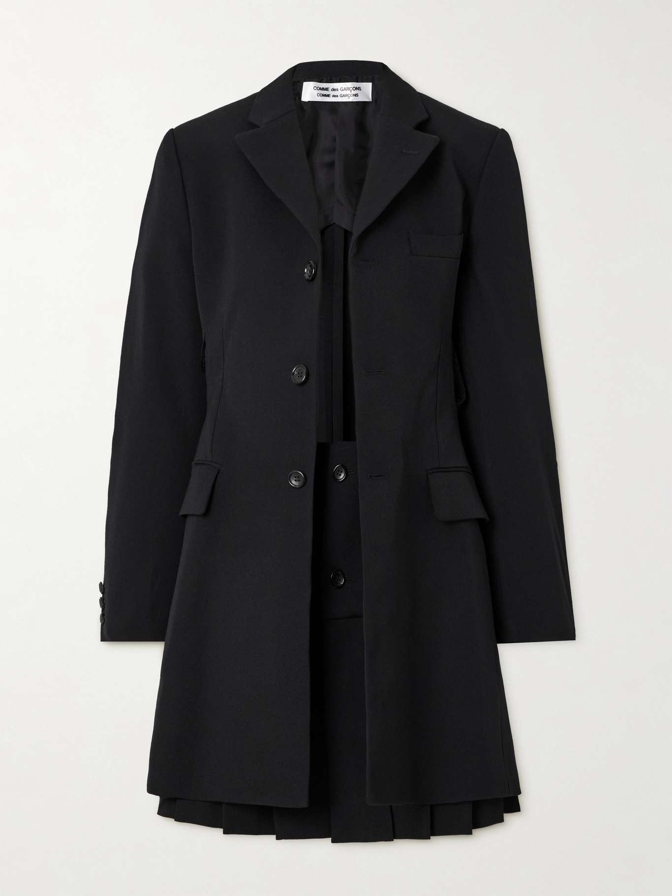 EDITORS'NOTES Comme des Garcons Comme des Garcons' blazer captures the label's eye for the unexpected. Tailored from wool-twill, it's cut in a long, hourglass shape and has pleated front panels that can be buttoned together to resemble a mini skirt. Wear yours with pants to create a layered effect. SIZE & FIT Model measurements: - Size 1 = XS, 2 = S, 3 = M, 4 = L and 5 = XL - Fits true to size, take your normal size - Designed for a slightly loose fit - Mid-weight, non-stretchy fabric - Model is 180cm/ 5'11" and is wearing the designer's size 2 - Bust: 85cm/ 33.5" - Waist: 62cm/ 24.5" - Hip: 88cm/ 34.5" DETAILS & CARE - Black wool-twill - Button fastenings through front - 100% wool; lining: 100% cupro - Dry clean - Mother-of-pearl: Tahiti