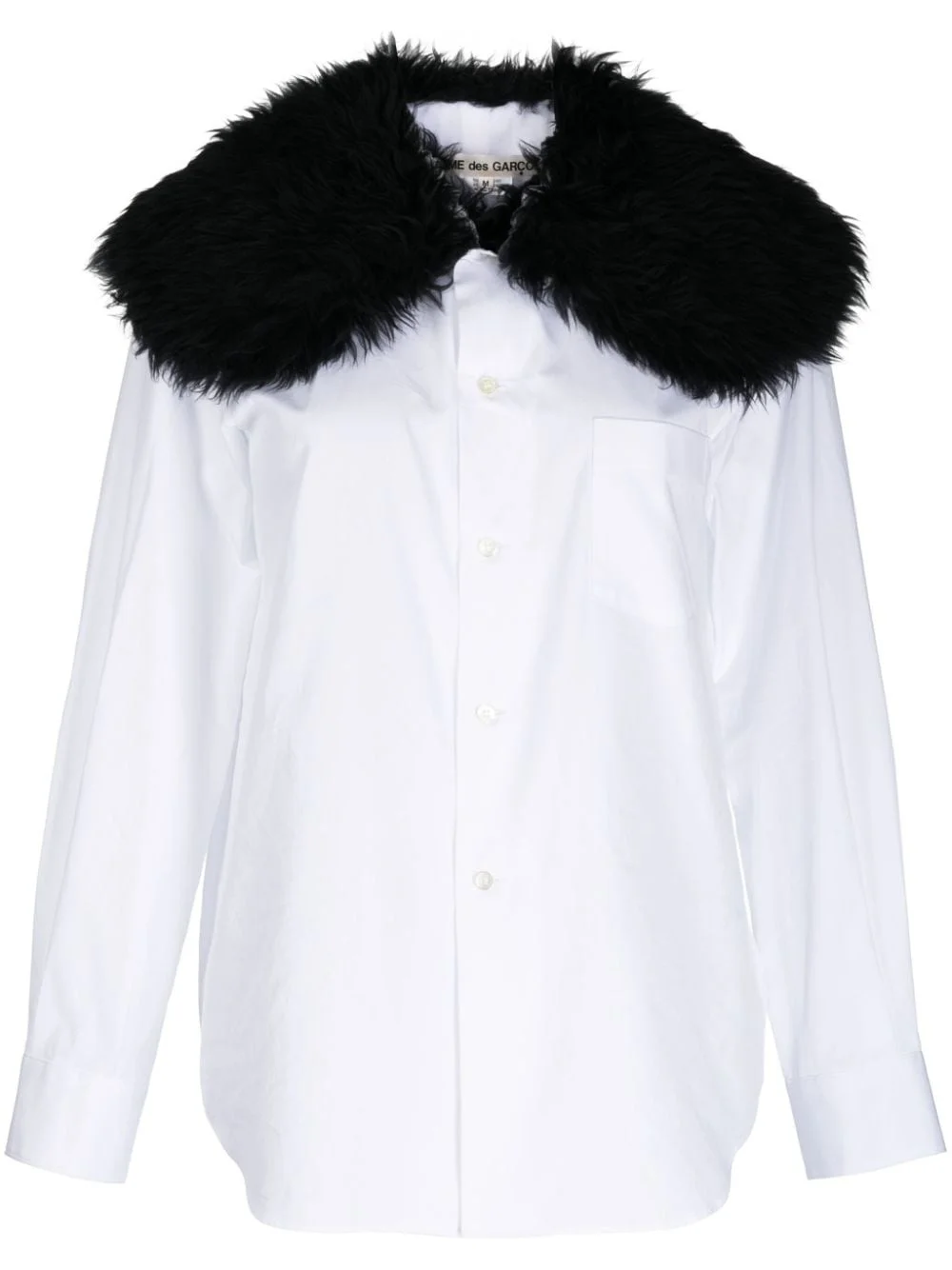contrasting-collar long-sleeve shirt Highlights - White/black - Cotton - Contrasting faux-fur collar - Front button fastening - Long sleeves - Buttoned cuffs - Chest patch pocket - Curved hem Imported Composition Base: Polyester 100% Body: Cotton 100% Lining: Cupro 100% SIZE & FIT Model measurements Height 5 ft 9 in(1.76 m) Bust/Chest 31.1 in(79 cm) Hips 35.03 in(89 cm) Waist 24.4 in(62 cm) FittingInformation Designed to be unstructured, offering a loose fit throughout Made from a midweight non-stretch fabric This piece fits true to size – take your usual size