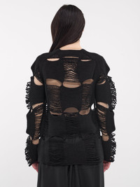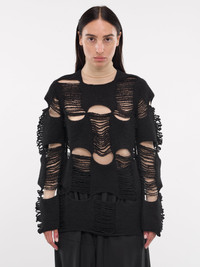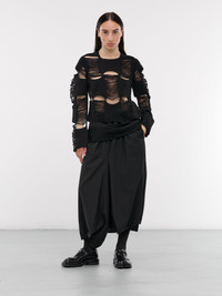COMME DES GARCONS sweater in black, paneled wool knit construction, heavy distressing throughout, squared neck, long sleeves, raw hems, straight hem, relaxed fit. Made in Japan 100% Wool Standard Sizing Model is 5'6" wearing size S. Bust: 31" Waist: 24" Hips: 34"