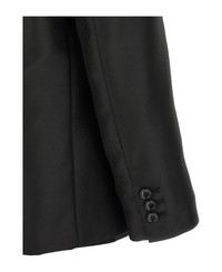 Blazer composed of two parts joined by a back strap to create a double layer effect on the front, the left part in coarse-grained ribbed fabric, the right part in micro ribbed fabric, single-breasted model with front button closure, mirror lapels, breast pocket, flap pockets, structured shoulder strap, long sleeves, bare back, cupro lining. Composition: 100% polyester Made in: Japan Color: Black Size and fit: - true to size fit Model number: GPJ0261