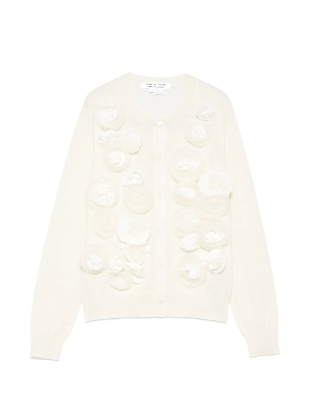 flower cardigan Highlights - Ivory - Floral appliques - Round neck - Button fastening - Long sleeves - Ribbed trims Imported Composition Wool 100% Washing instructions Dry Clean Only