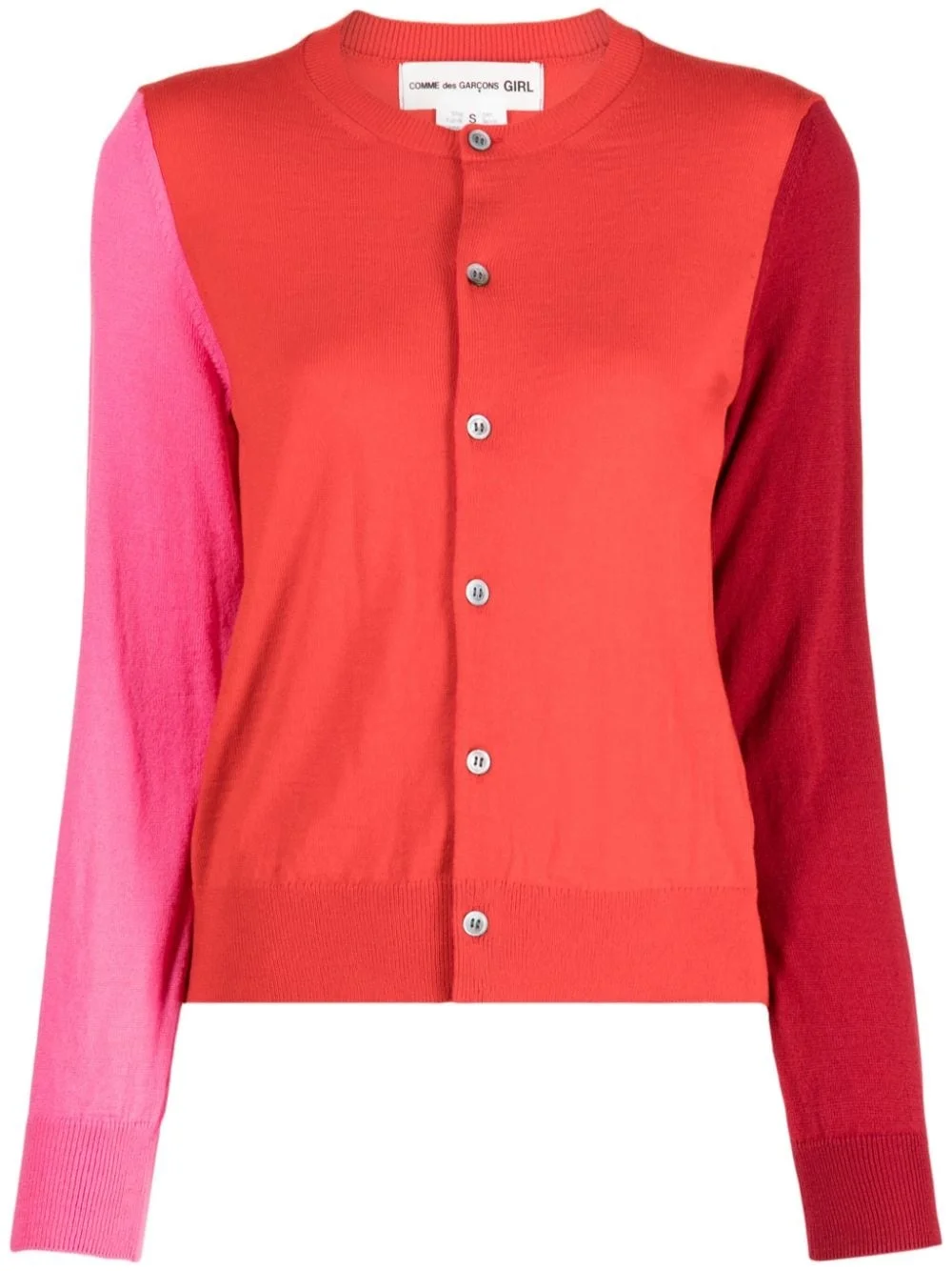 colour-block cardigan Capturing Comme des Garcons Girl's playful spirit, this fine-knit cardigan is characterised by its colour-block construction. It's rendered in a bright-red hue with contrasting dark-red and bubblegum-pink sleeves. Highlights - Bright red/dark red/bubblegum pink - Wool blend - Colour-block design - Crew neck - Front button fastening - Ribbed cuffs and hem Imported Composition Acrylic 70%, Wool 30% SIZE & FIT Model measurements Height 5 ft 9 in(1.76 m) Bust/Chest 33.46 in(85 cm) Hips 37 in(94 cm) Waist 23.62 in(60 cm) Measurement SLEEVE LENGTH 22.83 in(58 cm) Shoulder Width 12.99 in(33 cm) LENGTH 20.86 in(53 cm) BUST 30.7 in(78 cm) FittingInformation Designed for a slim fit that sits just away from the body offering a close yet comfortable fit The ribbed hem offers a close, comfortable fit Made with a lightweight knit, this piece offers some stretch This piece fits true to size – take your usual size Washing instructions Dry Clean Only