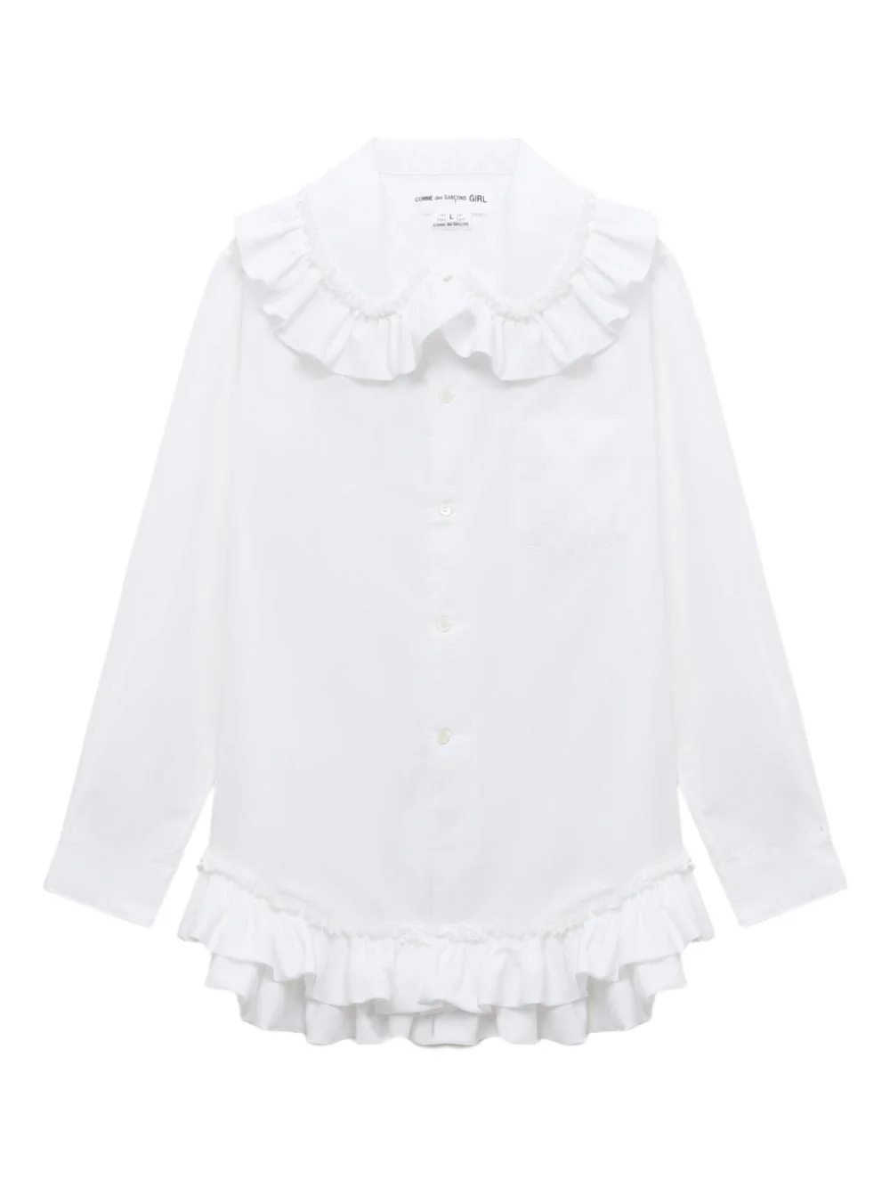 ruffled collar shirt Highlights - White - Ruffled collar - Button fastening - Chest pocket - Long sleeves - Ruffled hem Imported Composition Polyester 100% Washing instructions Read Manufacturer Guidelines