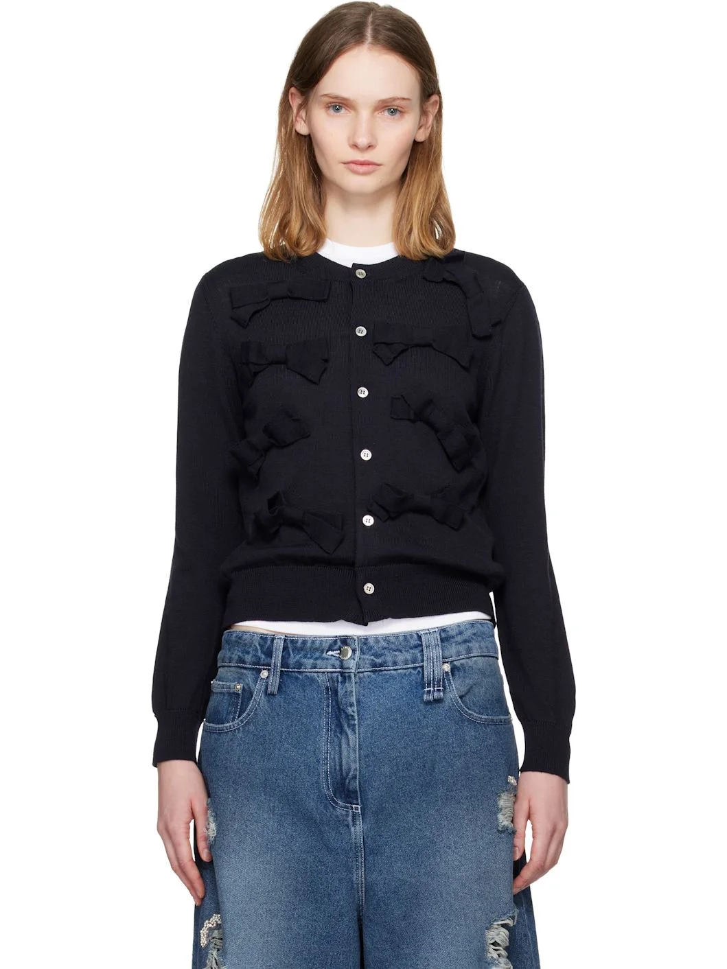 Knit wool cardigan. · Rib-knit crewneck, hem, and cuffs · Button closure · Bow accents at front · Mother-of-pearl hardware Supplier color: Navy 100% wool. Made in Japan 252670F095000