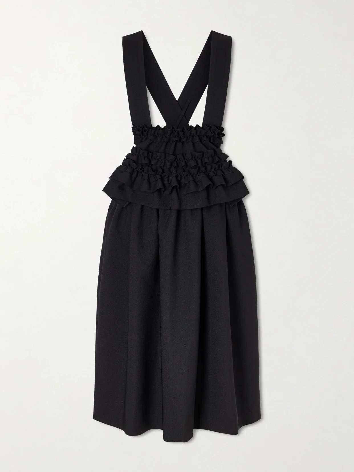 Comme des Garcons's dress is part of the Spring '26 'The Damaging of Perfect Things' collection, where beauty is found in imperfect, fractured forms. Made from stretch georgette, it has a pinafore-like silhouette with two distinctive straps and falls to a midi length. Style it over a ruffled blouse.