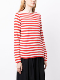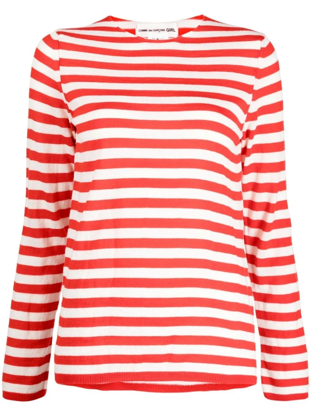 striped wool-blend jumper Comme des Garcons Girl's playful approach to colour and prints is captured in this jumper, which is woven with a touch of wool in Japan and elevated with white and bright-red stripes. Highlights - White/red - Wool blend - Horizontal stripe pattern - Crew neck - Long sleeves - Ribbed cuffs and hem Imported Composition Acrylic 70%, Wool 30% SIZE & FIT Model measurements Height 5 ft 9 in(1.76 m) Bust/Chest 33.46 in(85 cm) Hips 37 in(94 cm) Waist 23.62 in(60 cm) Measurement BUST 35.43 in(90 cm) LENGTH 25.59 in(65 cm) SLEEVE LENGTH 24.8 in(63 cm) Shoulder Width 14.56 in(37 cm) FittingInformation Designed to be unstructured, offering a loose fit throughout Made with a lightweight knit, this piece offers some stretch This piece fits true to size – take your usual size Washing instructions Dry Clean Only
